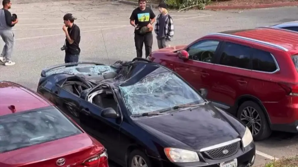 К счастью, колесо не попало в зрителей, а приземлилось прямо на парковку. Однако удар пришёлся точно по припаркованной Kia, которая фактически осталась без крыши и задней части.