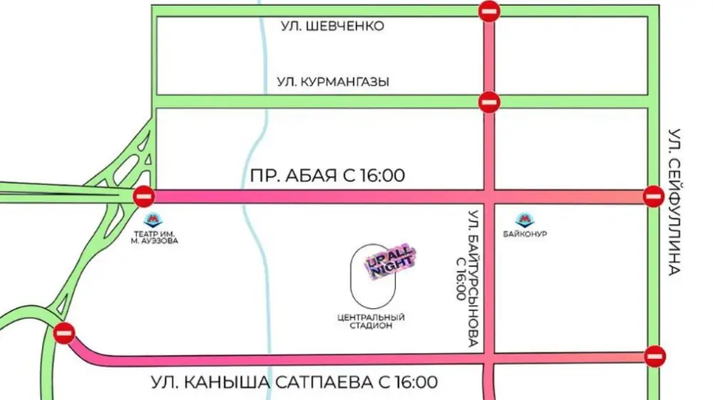 Департамент полиции Алматы опубликовал карту, согласно которой движение транспорта будет ограничено с 16:00 на трех участках: