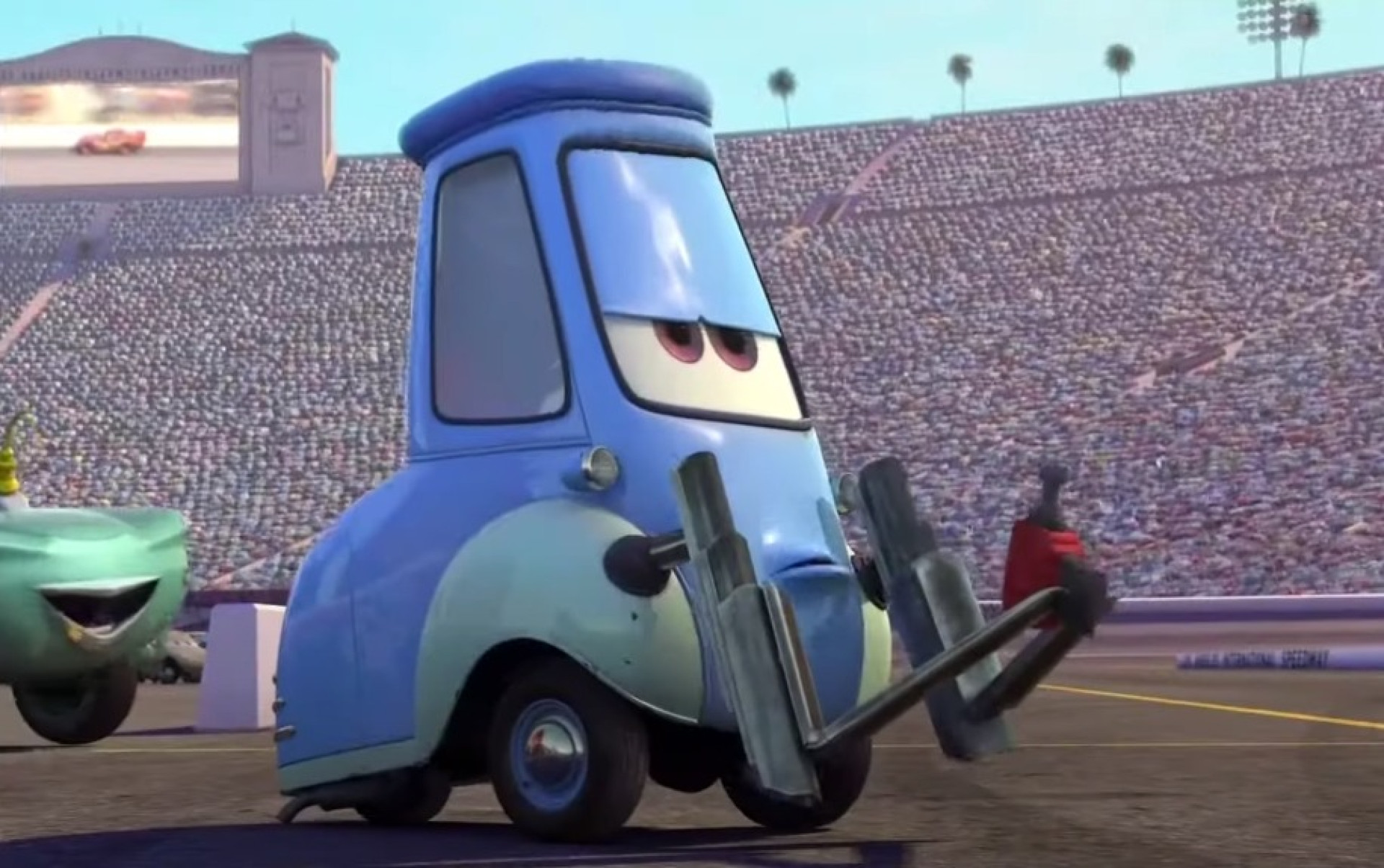 Юркость, добродушие и компактные размеры идеально передались Гвидо, который в мультфильме мастерски управляется с пневмопистолетом для колес и всегда оказывается в нужный момент рядом с друзьями.