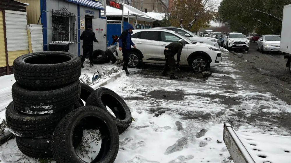 В Петропавловске 11 октября с утра выпал первый снег, на дорогах образовалась гололедица, а на шиномонтажках – огромные очереди.