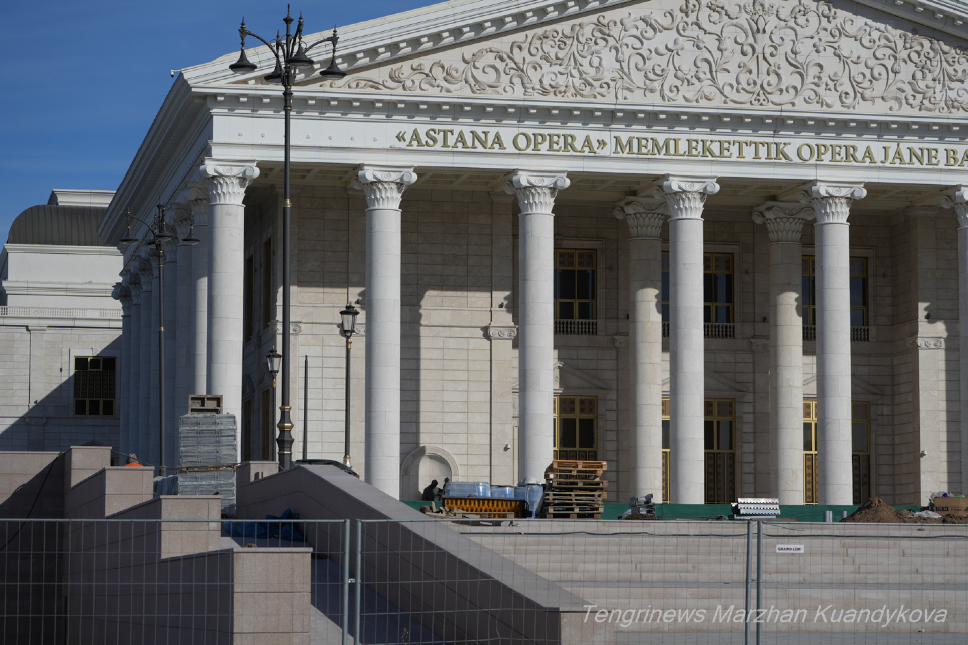 Парадная лестница, ведущая к зданию "Астана Оперы", практически полностью готова. Каких-либо кардинальных изменений в её дизайне не наблюдается.