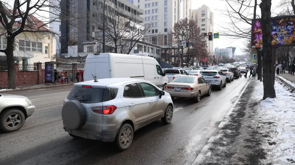 Пробки образовались на всех центральных улицах и выездах из города, передает Tengri Auto.