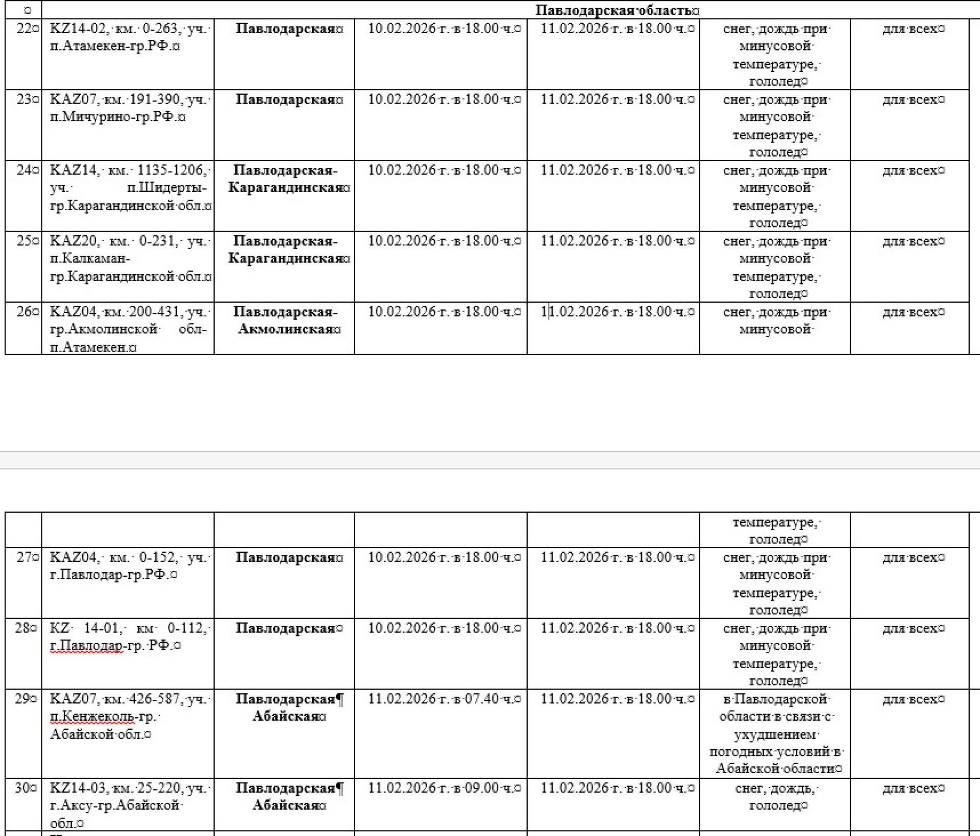 Как сообщили в пресс-службе "КазАвтоЖола", ограничения на трассах Павлодарской области введены из-за плохих погодных условий: минусовая температура, гололёд и снег.