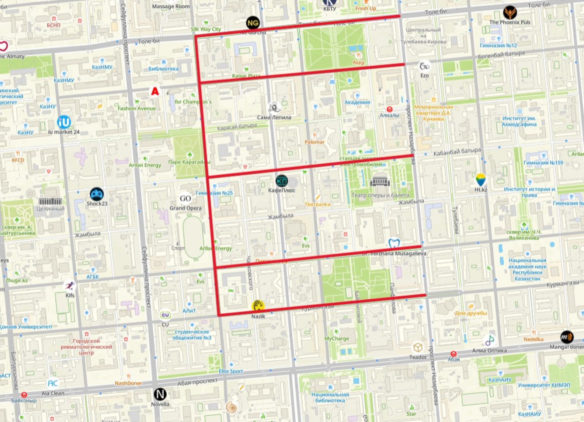 - с 08:00 до 10:00 – улица Толе би, от проспекта Абылай-хана до улицы Наурызбай-батыра (альтернативный проезд по улице Макатаева в обоих направлениях);