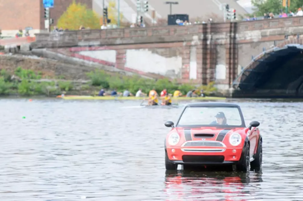 Британская марка легковых малолитражных автомобилей Mini превратила один из своих кабриолетов Сooper в моторную лодку, сообщает Motor.ru. Инициатором идеи стало американское подразделение Mini. В двухдневной гребной регате на реке Чарльз между городами Бостон и Кембридж им был необходим автомобиль службы спасения и конструкторы решили превратить малолитражку в автомобиль-катер. Компания изготовитель сначала сняла мерки с реального автомобиля Mini, а затем изготовила из стекловолокна кузов и закрепила его на основе небольшой лодки. Сверху были установлены оригинальные детали Cooper, включая фары головного света, задние фонари, решетку радиатора, колесные диски с шинами, рулевое колесо и шильдики. В движение Mini-лодка приводится при помощи мотора мощностью шесть лошадиных сил. Управляли водоплавающими "Купером" представители регаты, которые отвечают за ее безопасность.