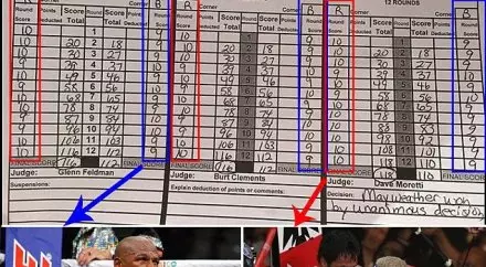 Масла в огонь подлил и опубликованный накануне официальный судейский протокол "боя века". На фото видно, что все трое судей - Гленн Фельдман, Берт Клементс и Дэйв Моретти - отдали победу Мейвезеру - 118:110, 116:112, 116:112. Однако болельщики тут же нашли в документе "грубую ошибку", которая, по их мнению, стоила победы филиппинцу. Дело в том, что судьи (это хорошо видно на фотографии протокола) присудили больше очков боксеру в "красном углу" и меньше очков боксеру в "синем углу". Как заметили зрители, в красном углу как раз и находился Пакьяо. Мейвезер же был в синем углу.