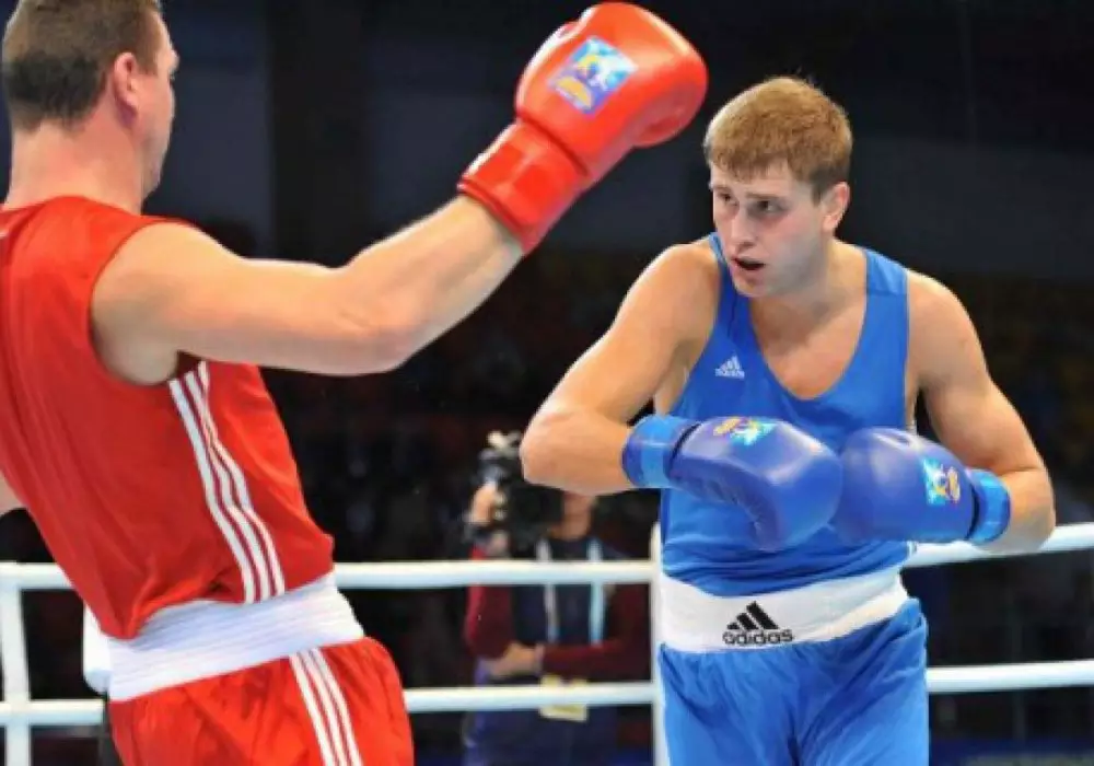 Казахстанский боксер выйдет на ринг в андеркарде боя Кличко - Фьюри Антон Пинчук (в синем). Фото с сайта vesti.kz
