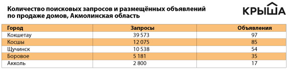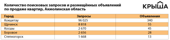 В одних населенных пунктах большинство покупателей заинтересованы исключительно в покупке домов, в других - квартир. В базе данных "Крыши" размещены объявления из 40 населенных пунктов области. На первом месте - областной центр Кокшетау. За месяц страницы с жилыми объектами в этом населенном пункте просмотрели более 96 000 раз, при этом количество размещенных объявлений о продаже квартир не превышает 350.
