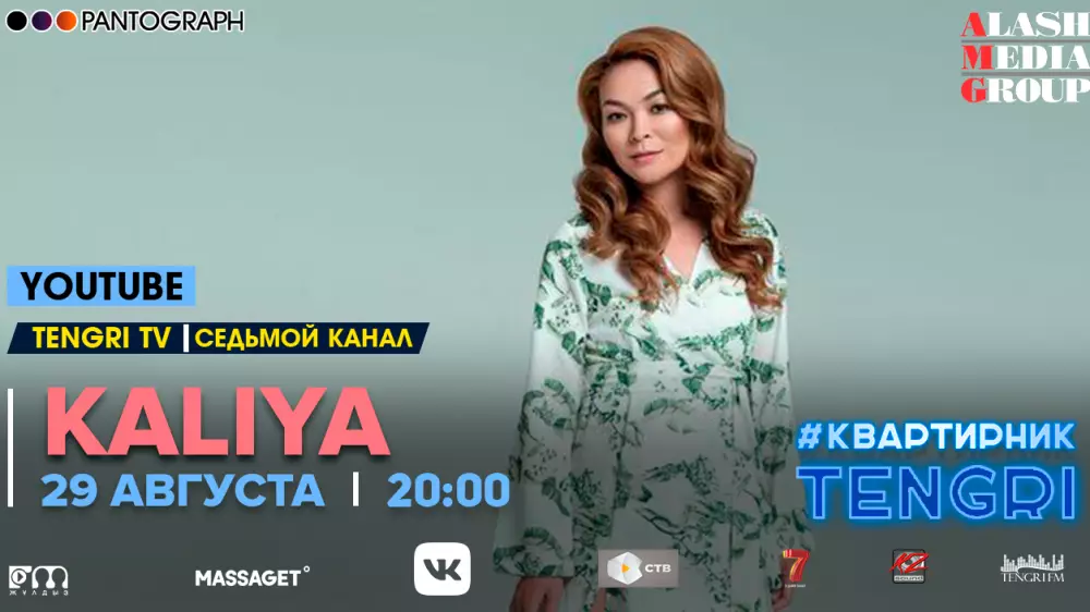Медиахолдинг Alash Media Group совместно с продюсерским центром Pantograph продолжает серию онлайн-концертов #КвартирникTengri. Концерт казахстанской певицы KALIYA пройдет в эфире YouTube-канала Tengri TV сегодня, 29 августа, в 20.00.