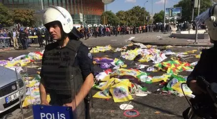 Офис премьера в письменном заявлении сообщил, что расследование теракта продолжается, прокуратура Анкары работает над установлением личностей погибших и проведением вскрытия. Напомним, два взрыва произошли в столице Турции перед началом митинга, который был организован профсоюзными и общественными организациями под лозунгами "Труд, мир, демократия" в знак протеста против всплеска насилия из-за турецко-курдского конфликта на юго-востоке страны. Как сообщают местные СМИ со ссылкой на источники в правоохранительных органах, взрывы были устроены террористами-смертниками в районе железнодорожного вокзала под эстакадой, где участники митинга проходили к месту его проведения.