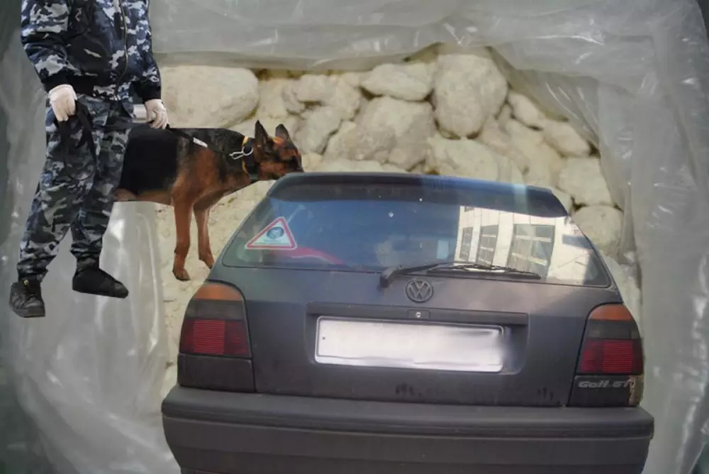 При помощи служебно-розыскной собаки по кличке Лада в салоне под обшивкой было обнаружено и изъято 8 велосипедных камер различной длины, запаянных с обеих сторон. При вскрытии камер в каждой из них было обнаружено вещество бело-бежевого цвета со специфическим запахом.