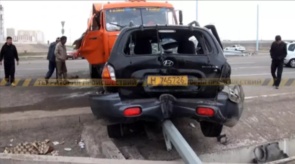 Авария произошла на улице Момышулы в ночь на 1 апреля. КамАЗ двигался в южном направлении в правом ряду. Позади него, в попутном направлении, ехал джип Hyundai. Обогнав грузовик, иномарка подрезала КамАЗ и попыталась повернуть направо. Однако грузовик протаранил джип, который от удара выкинуло на обочину. В результате Hyundai снес два фонарных столба, задел еще одну легковую машину и улетел в арык.