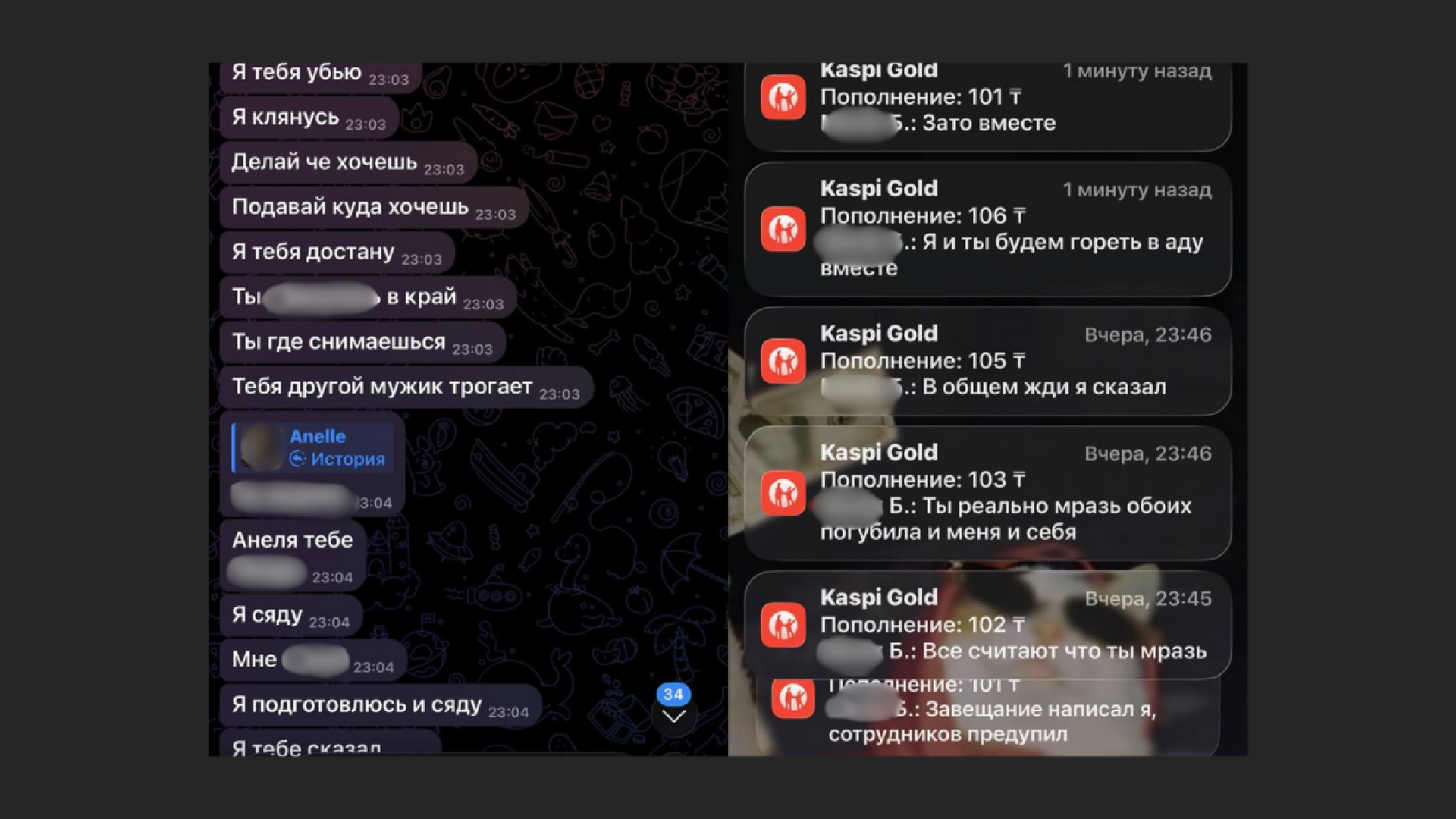 В интервью Tengrinews.kz женщина заявила, что супруг неоднократно избивал её, угрожал убийством, шантажировал интимными фото и создавал фейковые аккаунты для дискредитации.