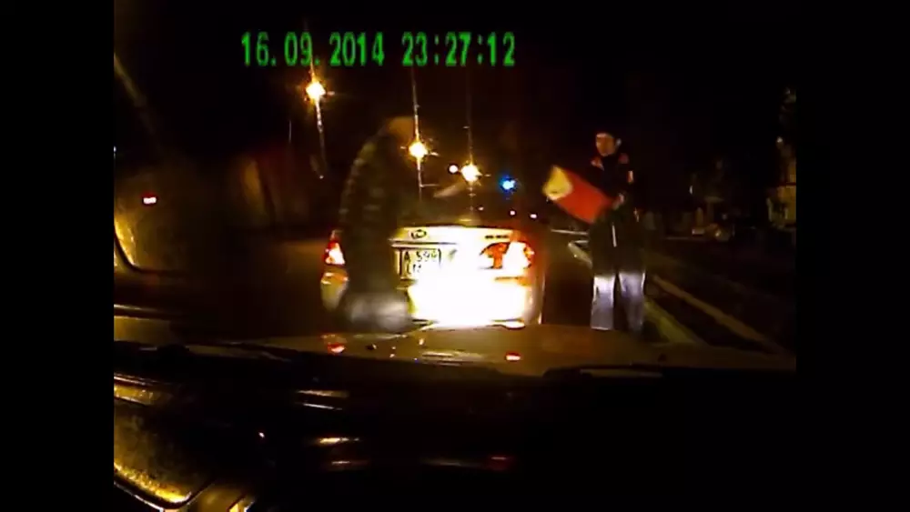 Судя по записи, сделана она была поздно вечером 16 сентября. На кадрах видно, как машину, где находятся парень с девушкой, просит остановиться водитель попутного авто. Сначала парень не соглашается, но потом все же тормозит. В свете фар можно рассмотреть номер и марку машины, остановившейся впереди - "Лексус" с номером А 598 UAO.