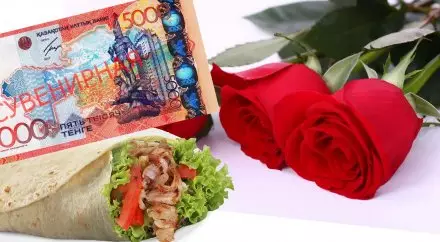 После цветов молодой человек купил шаурму в киоске на той же улице. Расплатился он снова сувенирной купюрой в пять тысяч тенге.