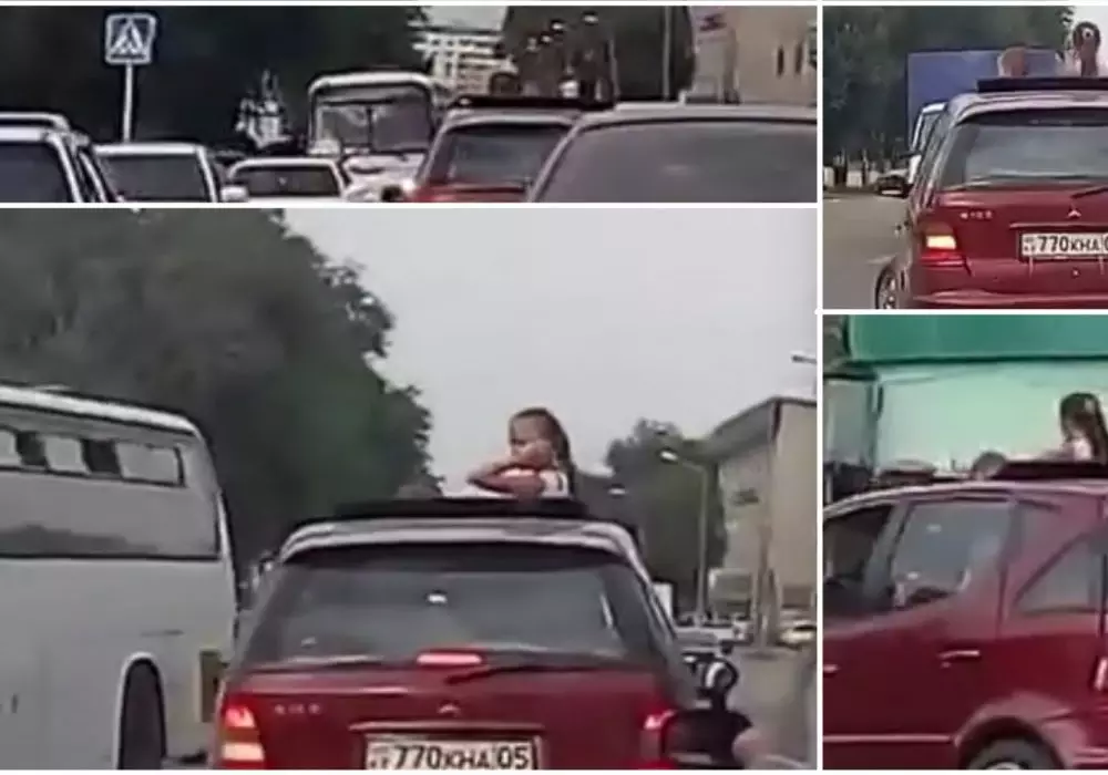 В городе Каскелен Алматинской области на видео засняли детей, которые едут в машине, высунувшись из люка, передает корреспондент Tengrinews.kz. Все происходит на оживленном перекрестке. Из люка Mercedes А-класса, зарегистрированного в Алматинской области, высовываются девочка в возрасте примерно десяти лет и мальчик - в возрасте около шести.