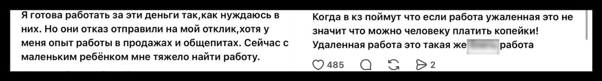 В соцсетях пост набрал свыше 149 тысяч просмотров и более сотни комментариев. Многие казахстанцы посчитали сумму зарплаты неприемлемой, но есть и те, кто нашли возможности в такой работе.