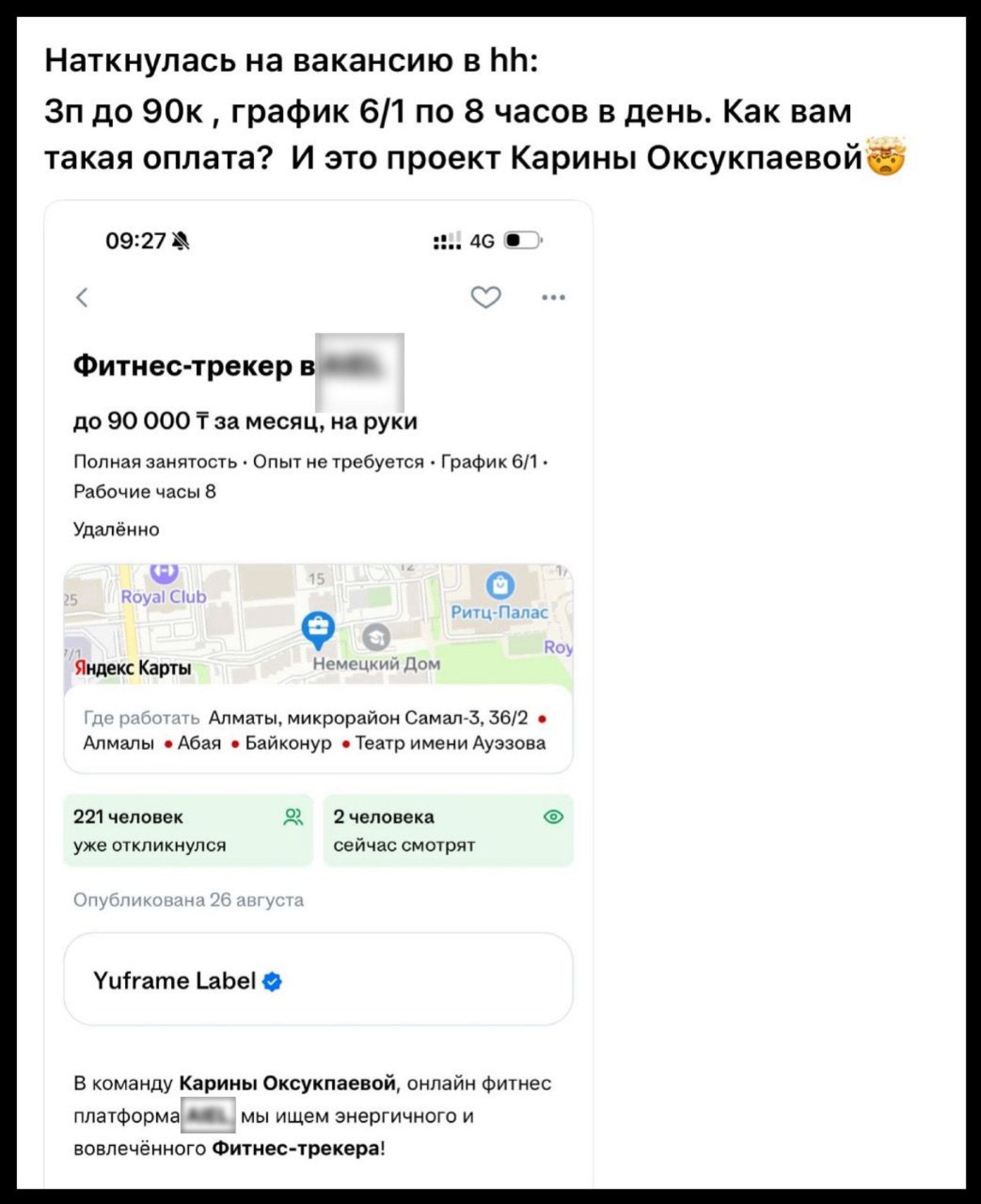 "Наткнулась на вакансию: зарплата - до 90 тысяч тенге, график 6/1 по 8 часов в день. Как вам такая оплата? Это проект Карины", - возмутилась пользовательница в соцсети.
