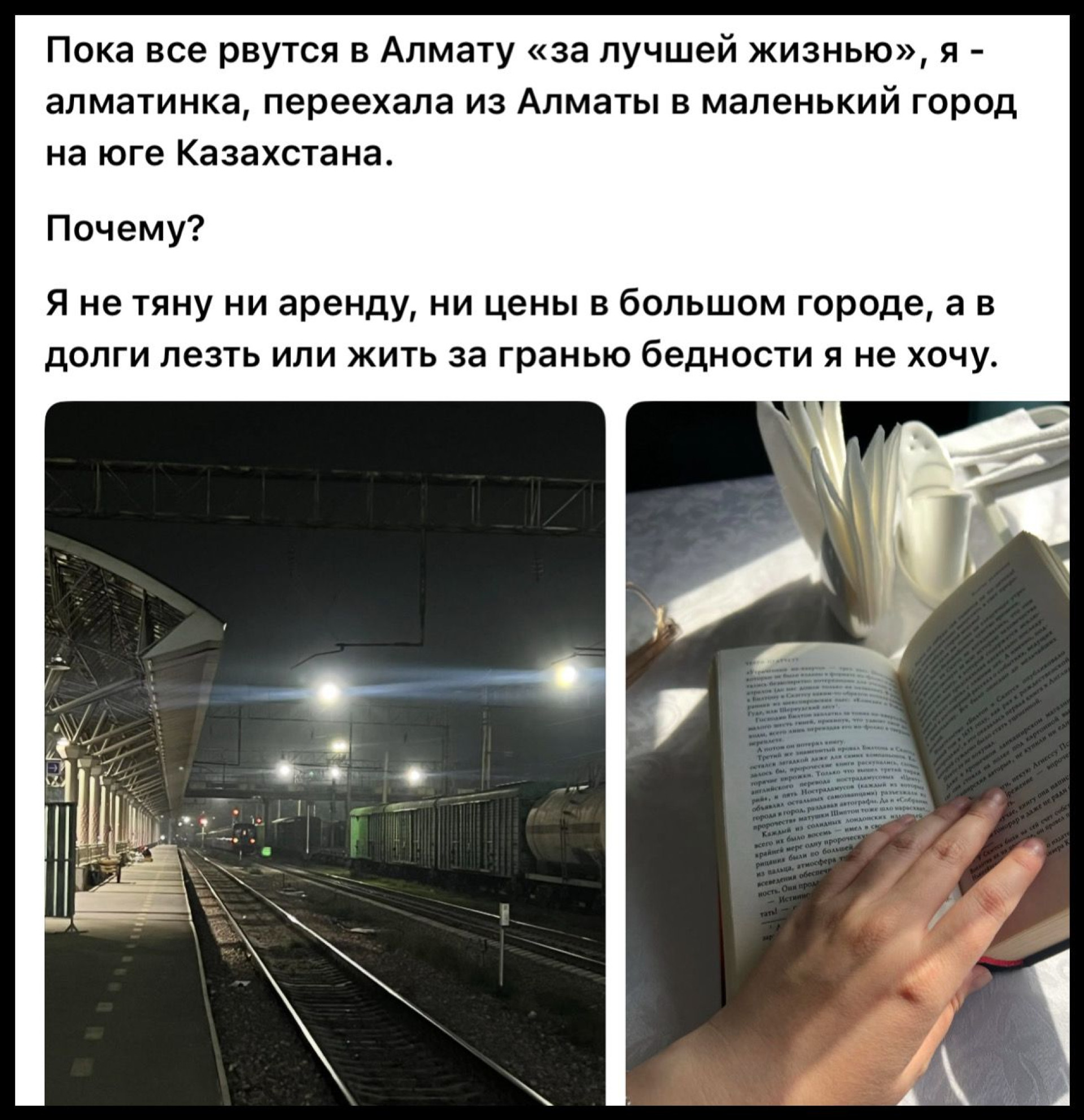 "Пока все рвутся в Алматы "за лучшей жизнью", я, коренная, переехала в небольшой город на юге Казахстана. Почему? Я не тяну ни аренду, ни цены в большом городе, а в долги лезть или жить за чертой бедности не хочу", – написала она в соцсетях.