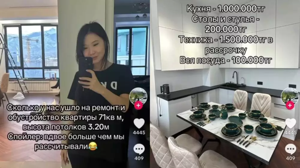 "Работа ремонтников – 2,4 миллиона. Черновые материалы – 1 457 000 тенге. Кухня – 1 миллион тенге. Техника – 1,5 миллиона тенге в рассрочку. Ламинат с плинтусом – 900 тысяч тенге. Диван – 250 тысяч тенге. Кровать с матрасом – 300 000 тенге", – рассказала она.