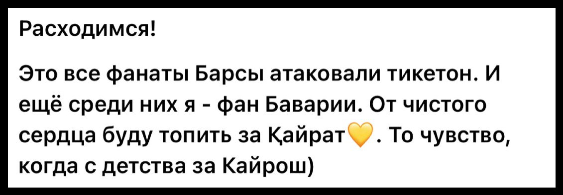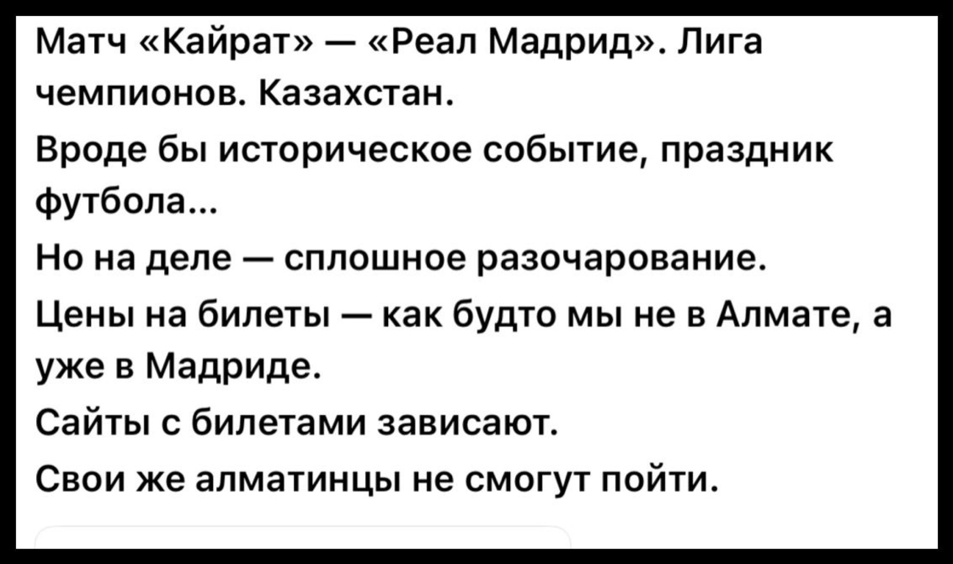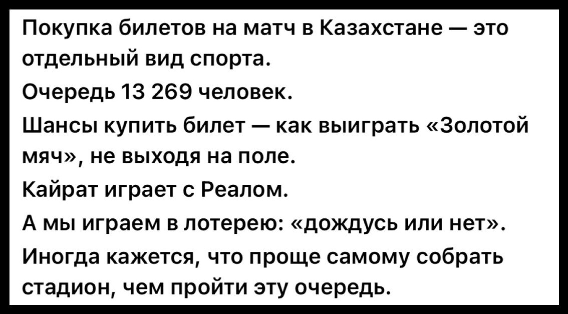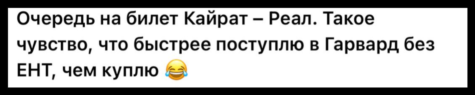 Не обошлось и без иронии. Пользователи соцсетей начали активно шутить на тему ажиотажа вокруг билетов. Кто-то пишет, что попасть на матч "Кайрат" - "Реал Мадрид" оказалось сложнее, чем поступить в Гарвард.