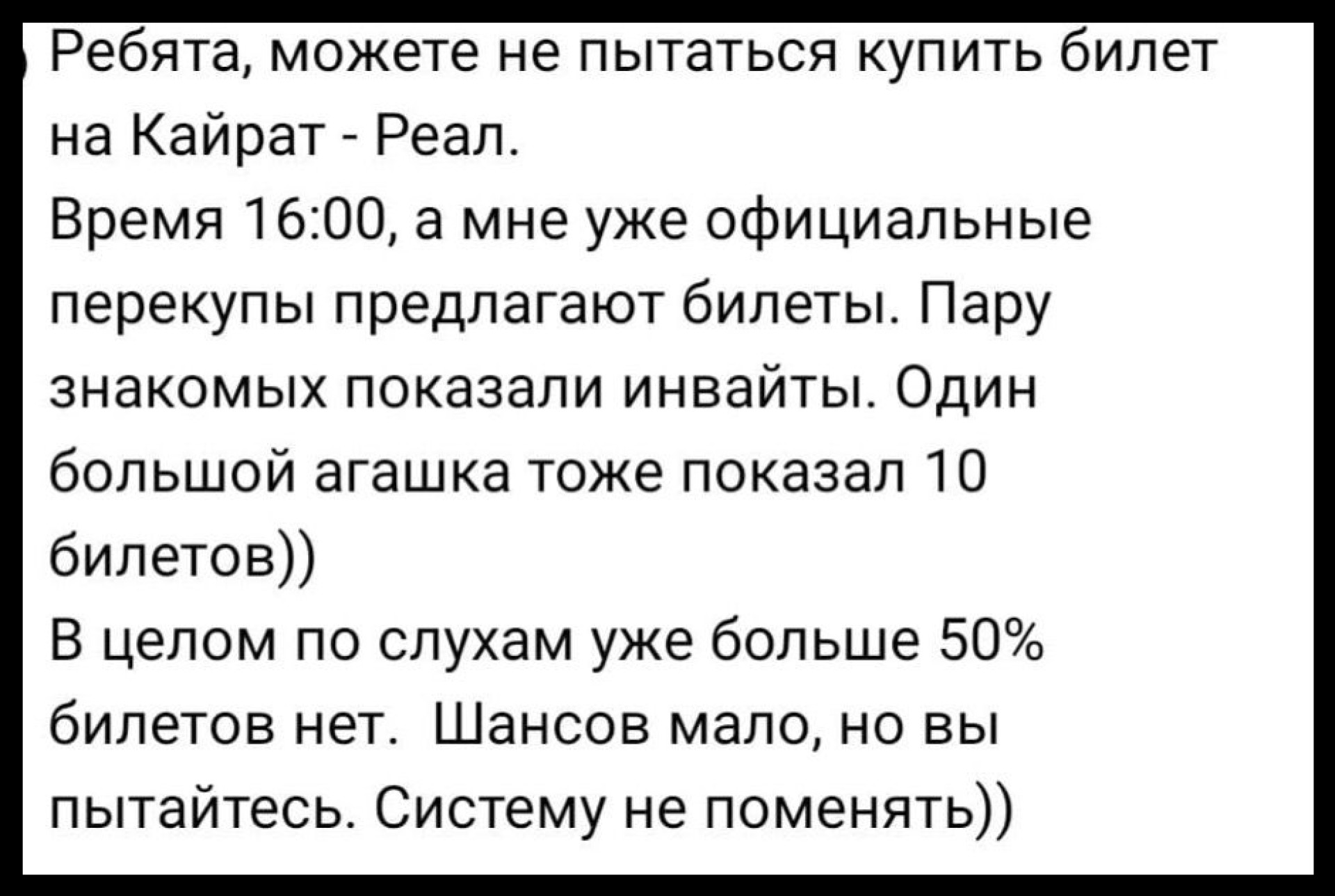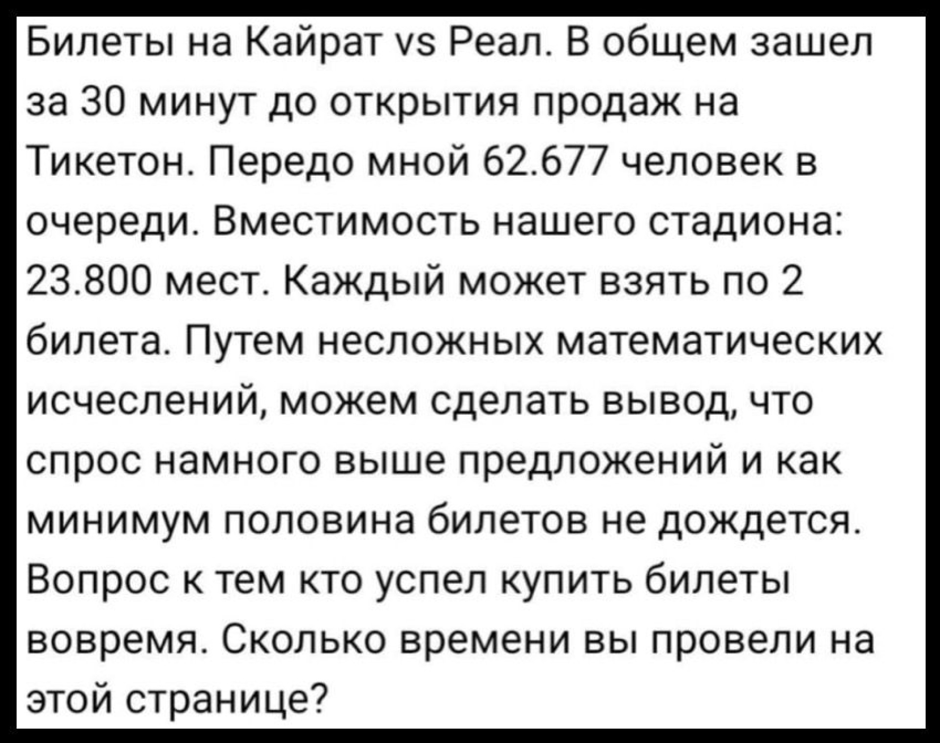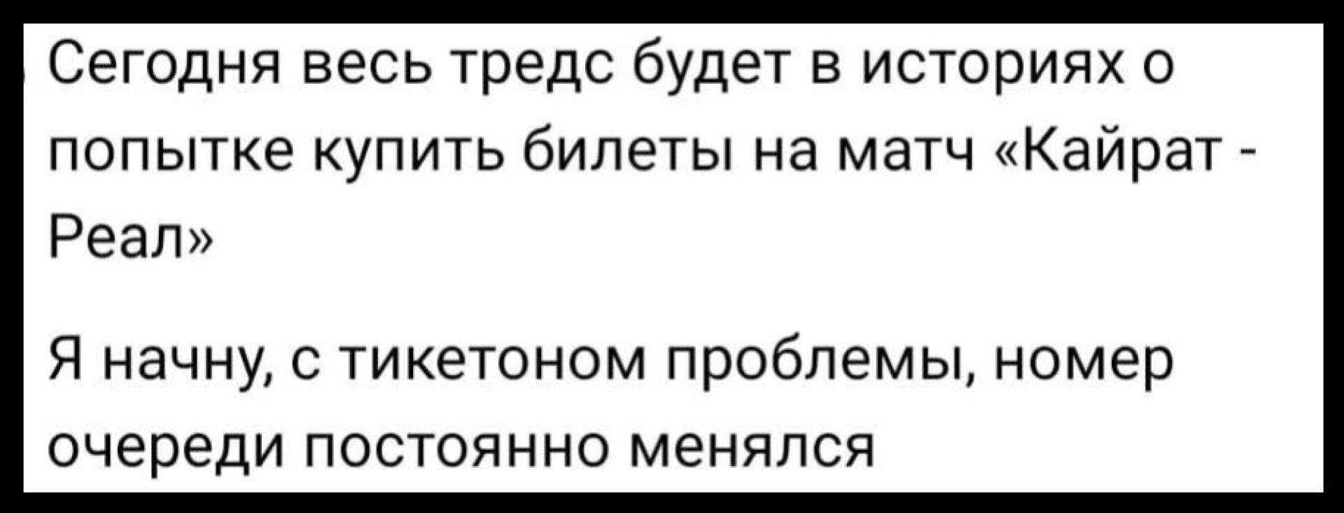 Не обошлось и без иронии. Пользователи соцсетей начали активно шутить на тему ажиотажа вокруг билетов. Кто-то пишет, что попасть на матч "Кайрат" - "Реал Мадрид" оказалось сложнее, чем поступить в Гарвард.