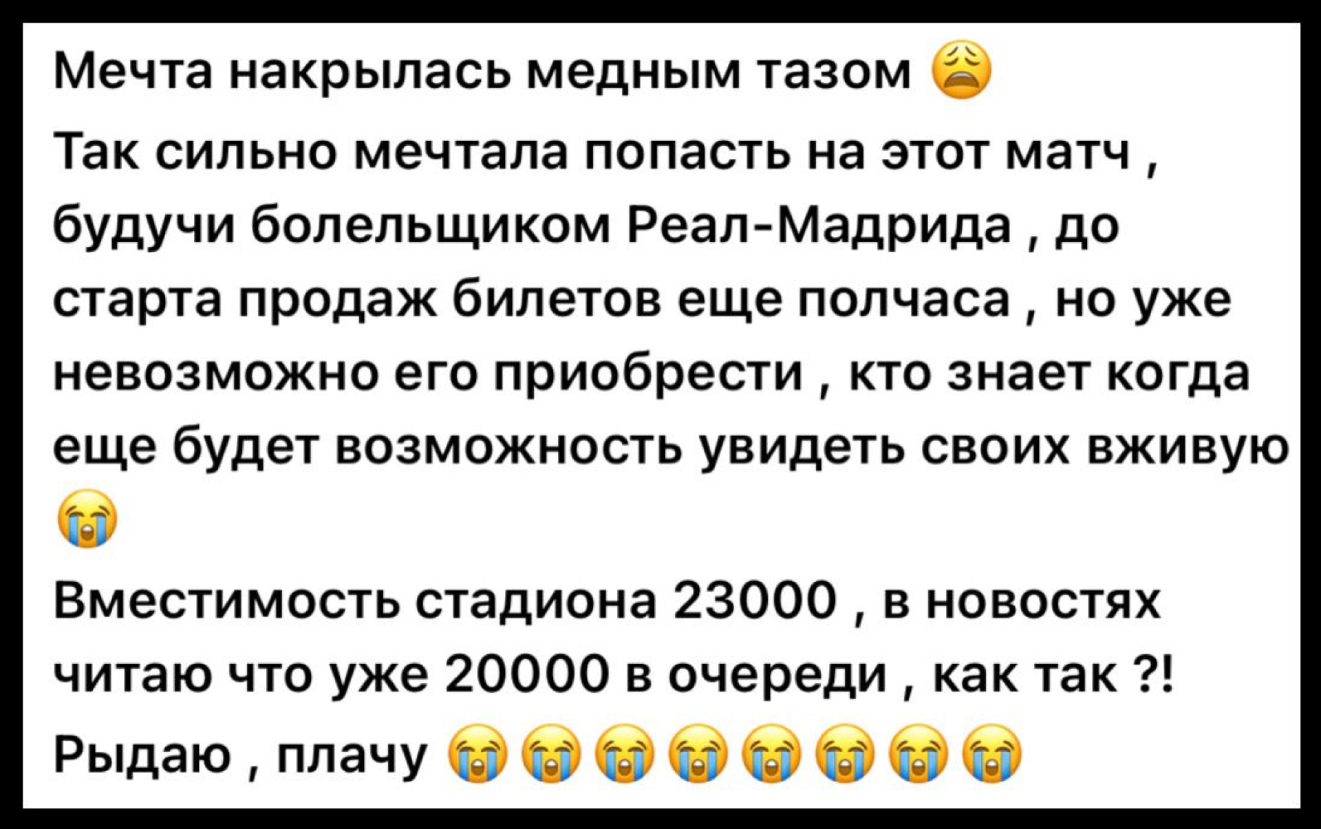 К сожалению, нам не удалось приобрести билеты на матч, хотя мы ждали более четырёх часов. Около 21:40 все места уже были раскуплены.