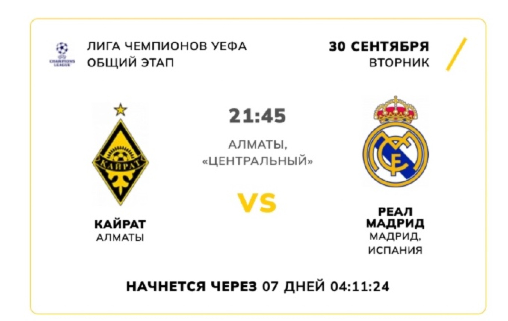 Сам матч между "Кайратом" и мадридским "Реалом" запланирован на 30 сентября.