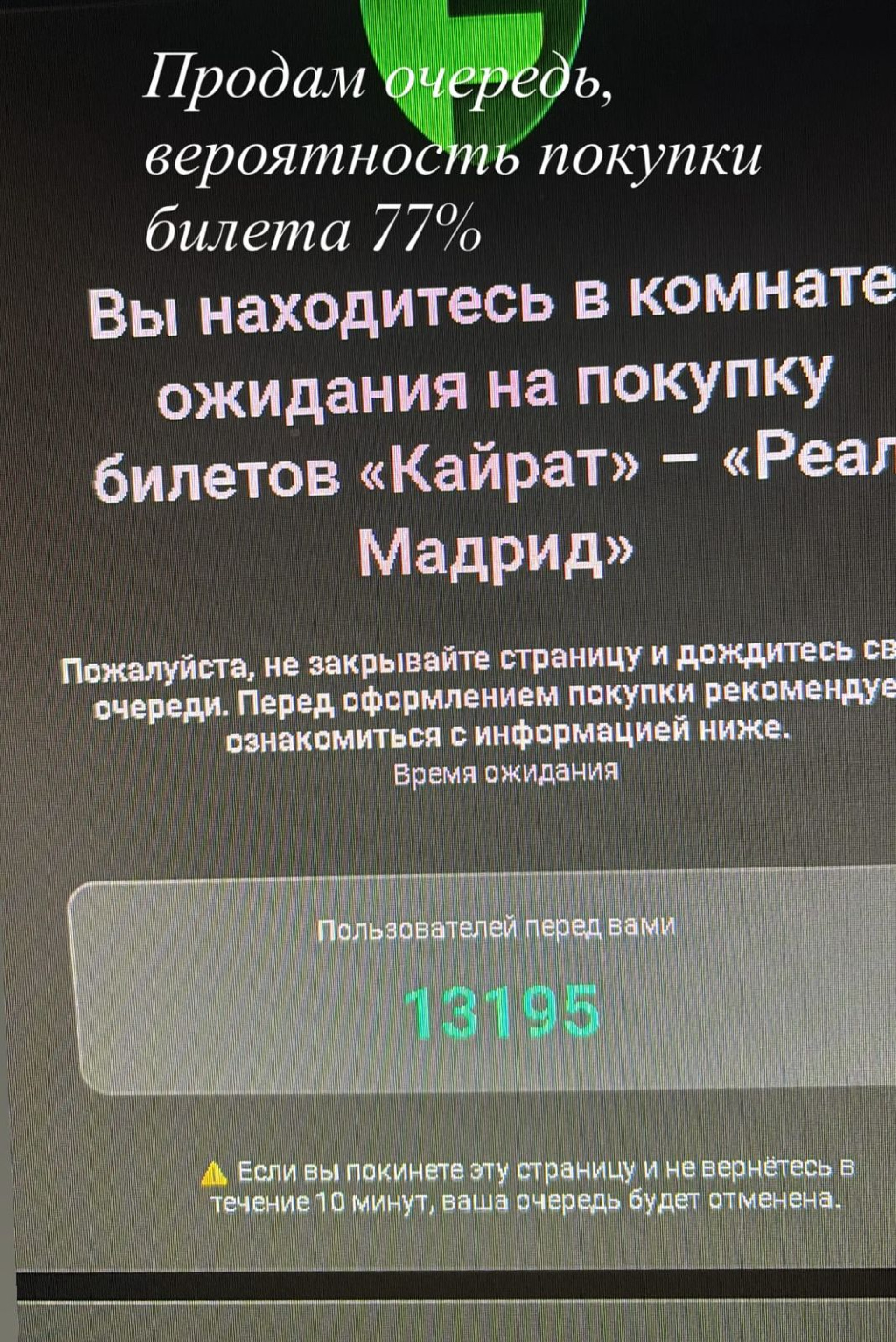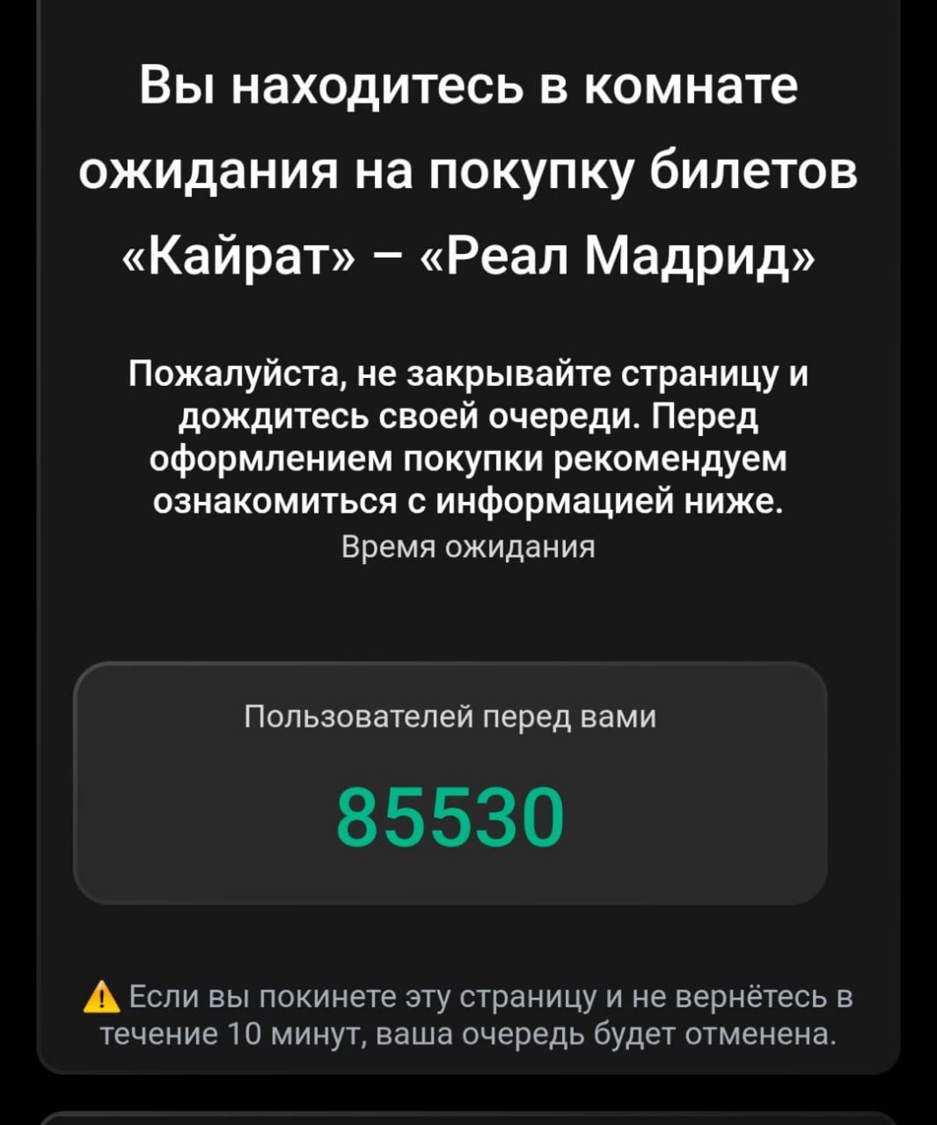 За 10 минут до старта мы открыли сразу три вкладки: официальный сайт клуба, платформу и приложение Qairat SuperApp. Организаторы заранее предупреждали, что при открытии продажи будет формироваться виртуальная очередь, поэтому мы, как и многие другие болельщики, сидели в ожидании со счётчиком на экране.