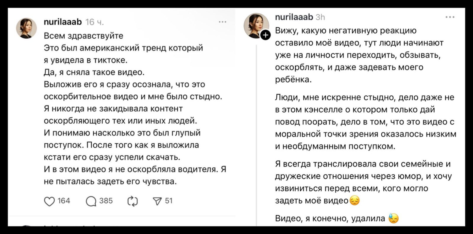 После волны критики Нурила объяснила, что не хотела никого задеть, и признала, что видео было ошибкой.