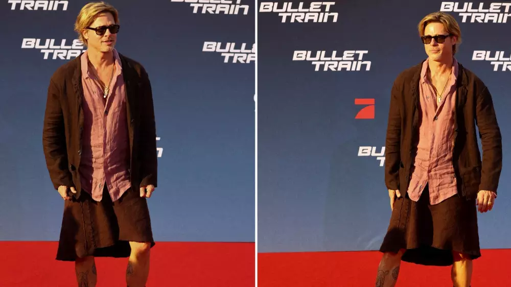 Образ Питта активно обсуждался в медиа, мало кто остался равнодушным к его выходу в льняном костюме, состоящем из темной юбки выше колен, пиджака в тон и мятой розовой рубашки. Яркий наряд артиста дополнили тогда кожаные ботинки на шнуровке.