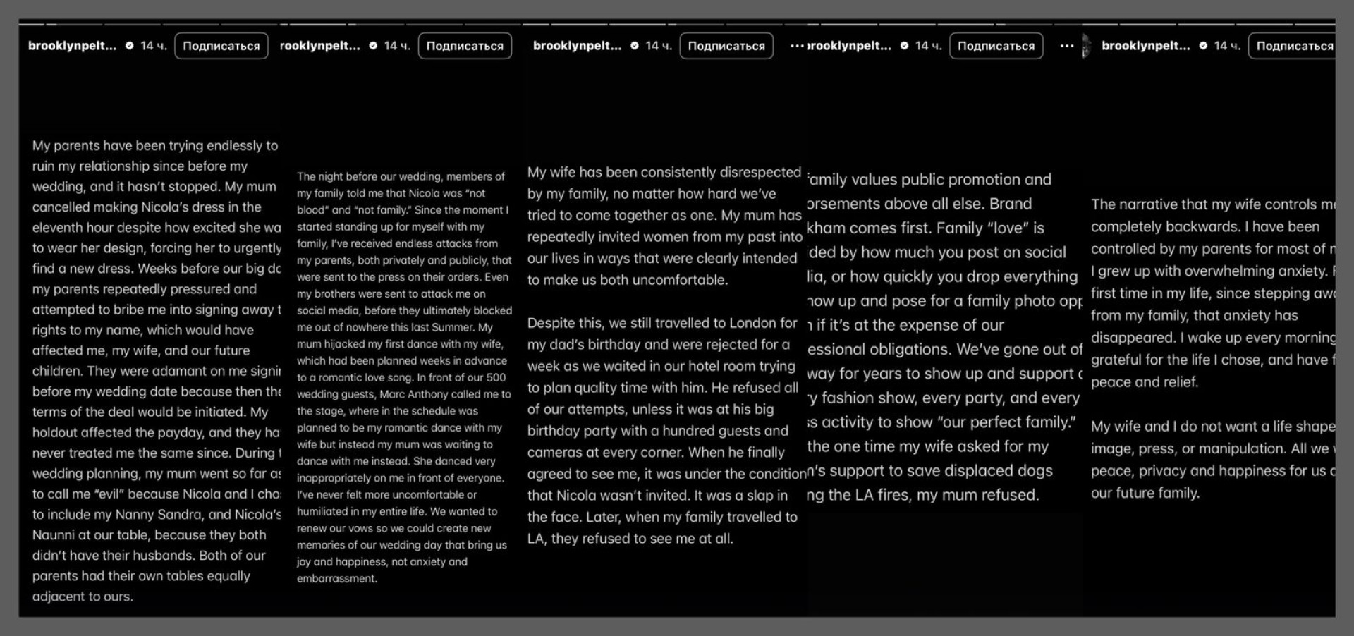 "Моя семья постоянно проявляла неуважение к моей жене, как бы мы ни старались быть единым целым. Моя мама неоднократно приглашала женщин из моего прошлого в нашу жизнь таким образом, чтобы мы оба чувствовали себя некомфортно. Пиар был ключевой ценностью моей семьи. Продвижение бренда Бекхэм считалось главным приоритетом, а проявления "любви" оценивались по частоте публикаций и готовности немедленно участвовать в семейных мероприятиях, даже если это мешало личным делам", — объяснил Бруклин.