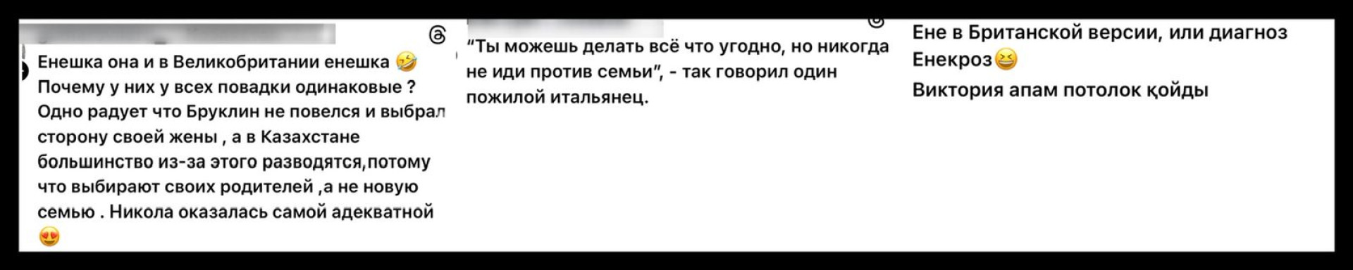 • "Одно радует: Бруклин не поддался и выбрал сторону своей жены. В Казахстане же большинство в таких случаях разводятся, потому что выбирают родителей, а не новую семью. Никола оказалась самой адекватной"