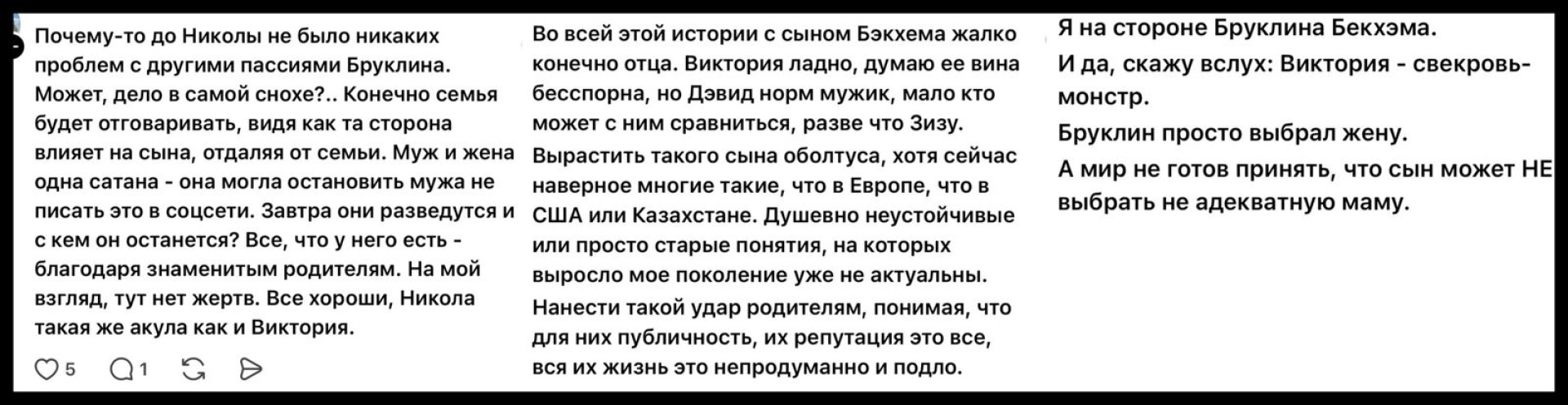 • "Я на стороне Бруклина Бекхэма. И да, скажу прямо: Виктория — свекровь-монстр. Бруклин просто выбрал жену, а мир ещё не готов принять, что сын может не выбрать неадекватную маму"