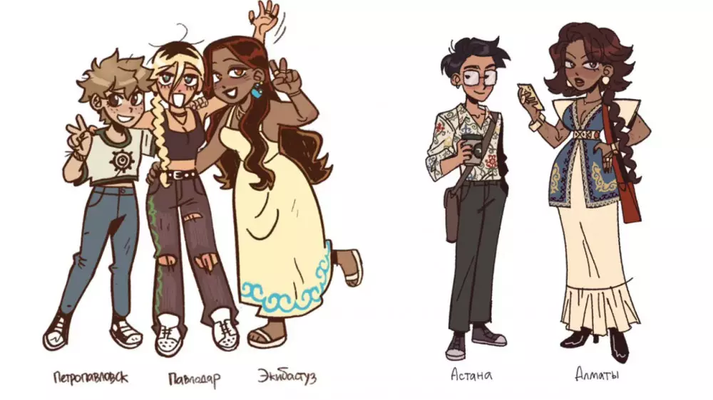 "Использовала для своих рисунков и то, чем славится город. К примеру, Актау ассоциируется у многих с Каспийским морем, поэтому изобразила девушку в купальнике. Также постаралась включать гербы некоторых городов в наряды героев, если внимательно присмотреться, можно заметить, например, в образе у Семея. Петропавловск я нарисовала, ориентируясь на своих друзей из этого города. В каждый образ постаралась включать национальные орнаменты", - рассказывает художница.