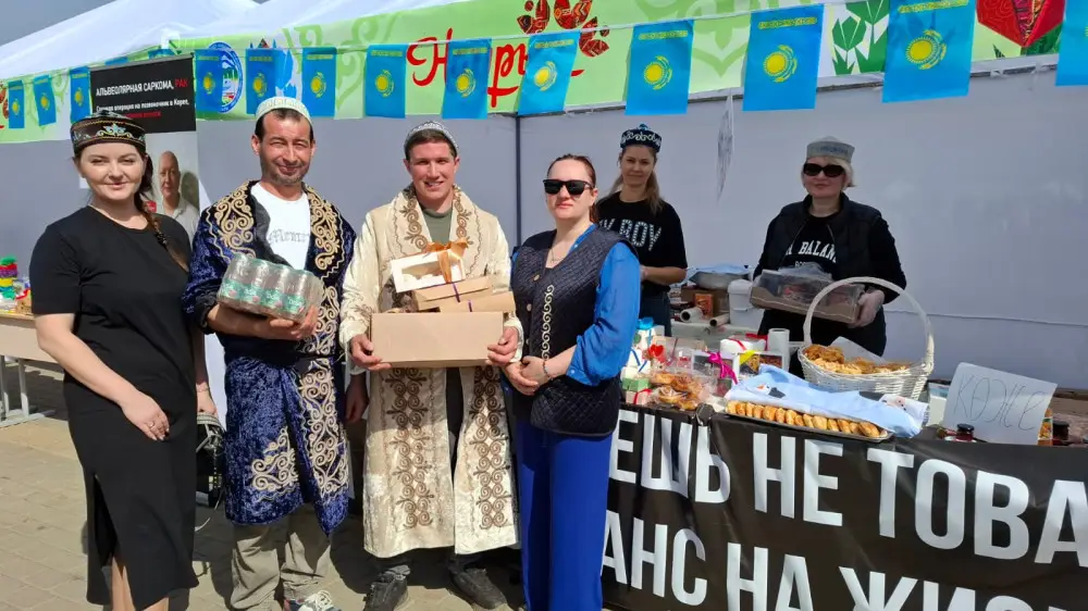 На ярмарке в честь Наурыза женщины и мужчины района надели национальные костюмы и встали за прилавки. Все собранные от продажи их продукции средства они передали Дмитрию.