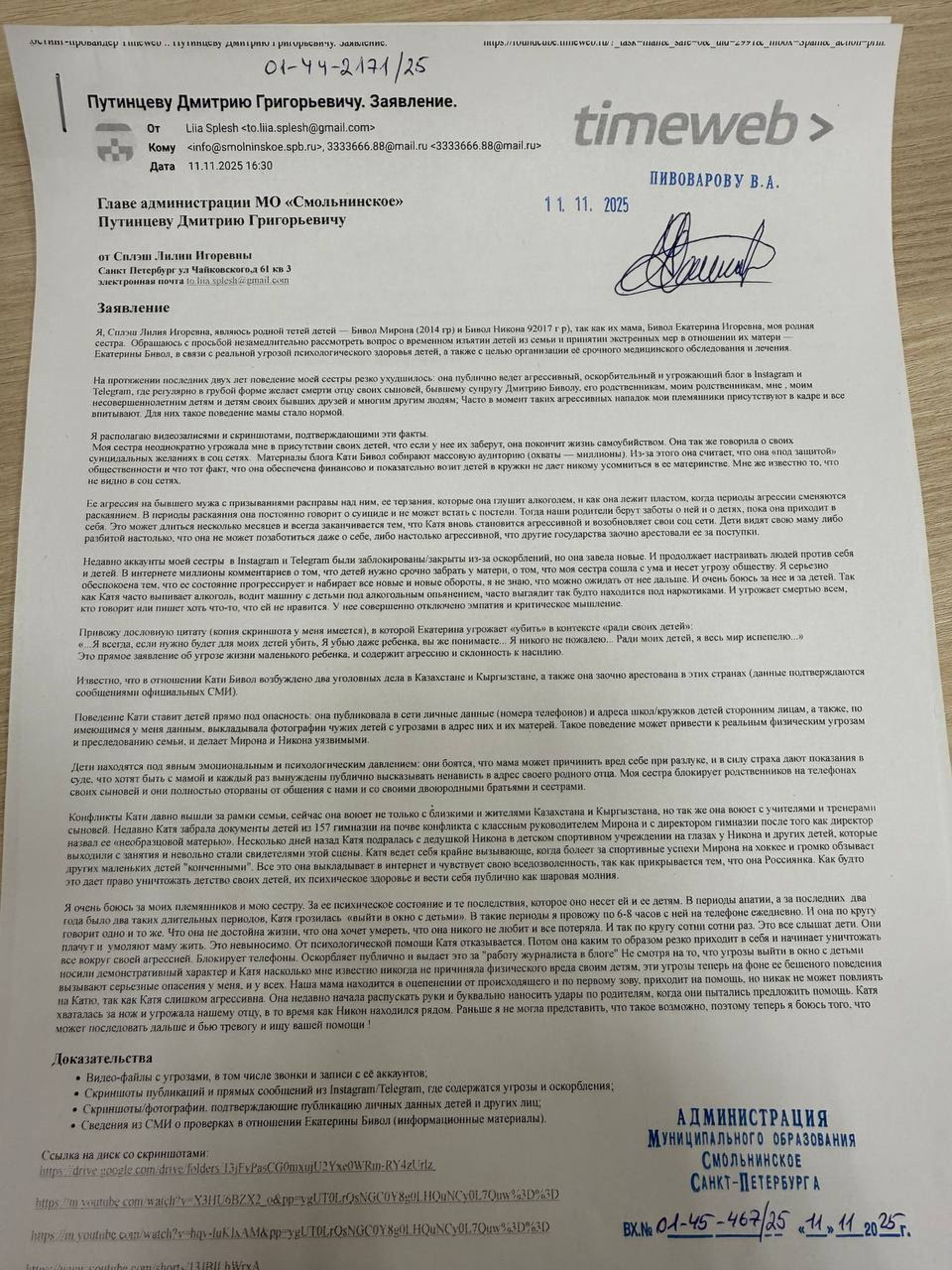 В документе якобы сестра просит "рассмотреть вопрос о временном изъятии детей из семьи" и "принять меры в отношении их матери".