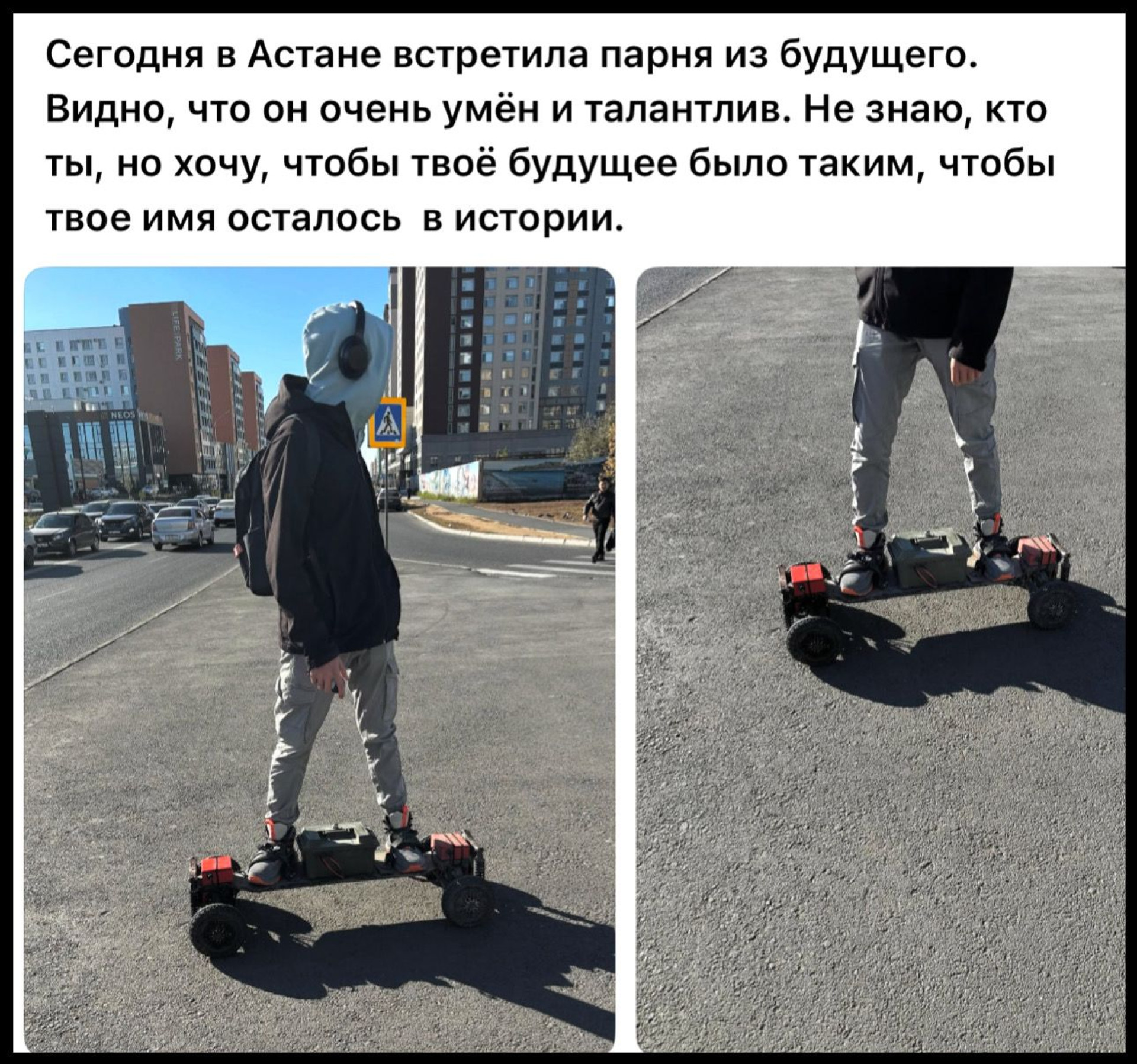 "Сегодня в Астане встретила парня из будущего. Видно, что он умный и талантливый. Не знаю, кто ты, но хочу, чтобы твоё имя осталось в истории", - написала автор публикации.