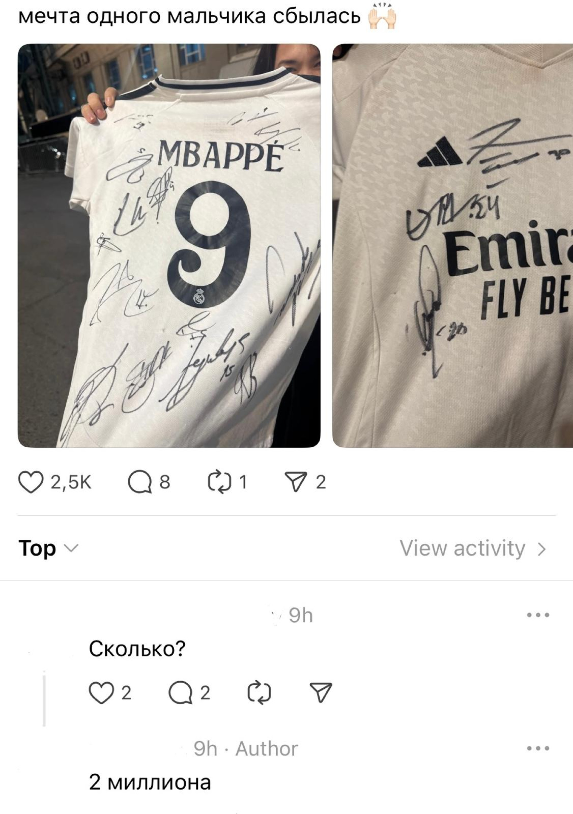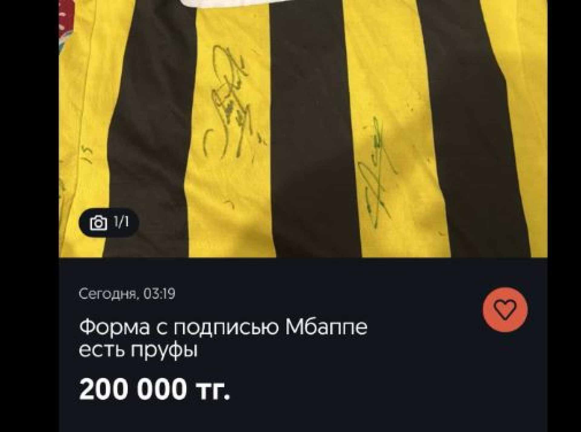 Однако самым дорогим лотом стало другое объявление: футболка с автографами сразу нескольких звезд, включая Мбаппе, оценена в 2 миллиона тенге.
