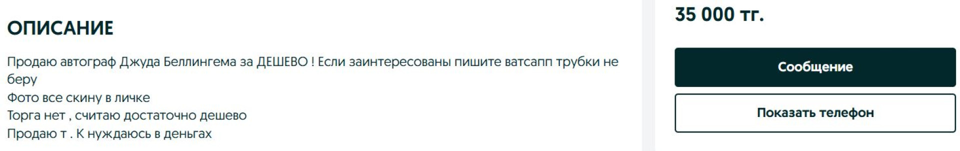 "Продаю автограф Джуда Беллингема задешево! Если заинтересованы — пишите. Фото все скину. Торга нет, считаю, достаточно дешево. Продаю, так как нуждаюсь в деньгах", — отмечает автор одного из объявлений.