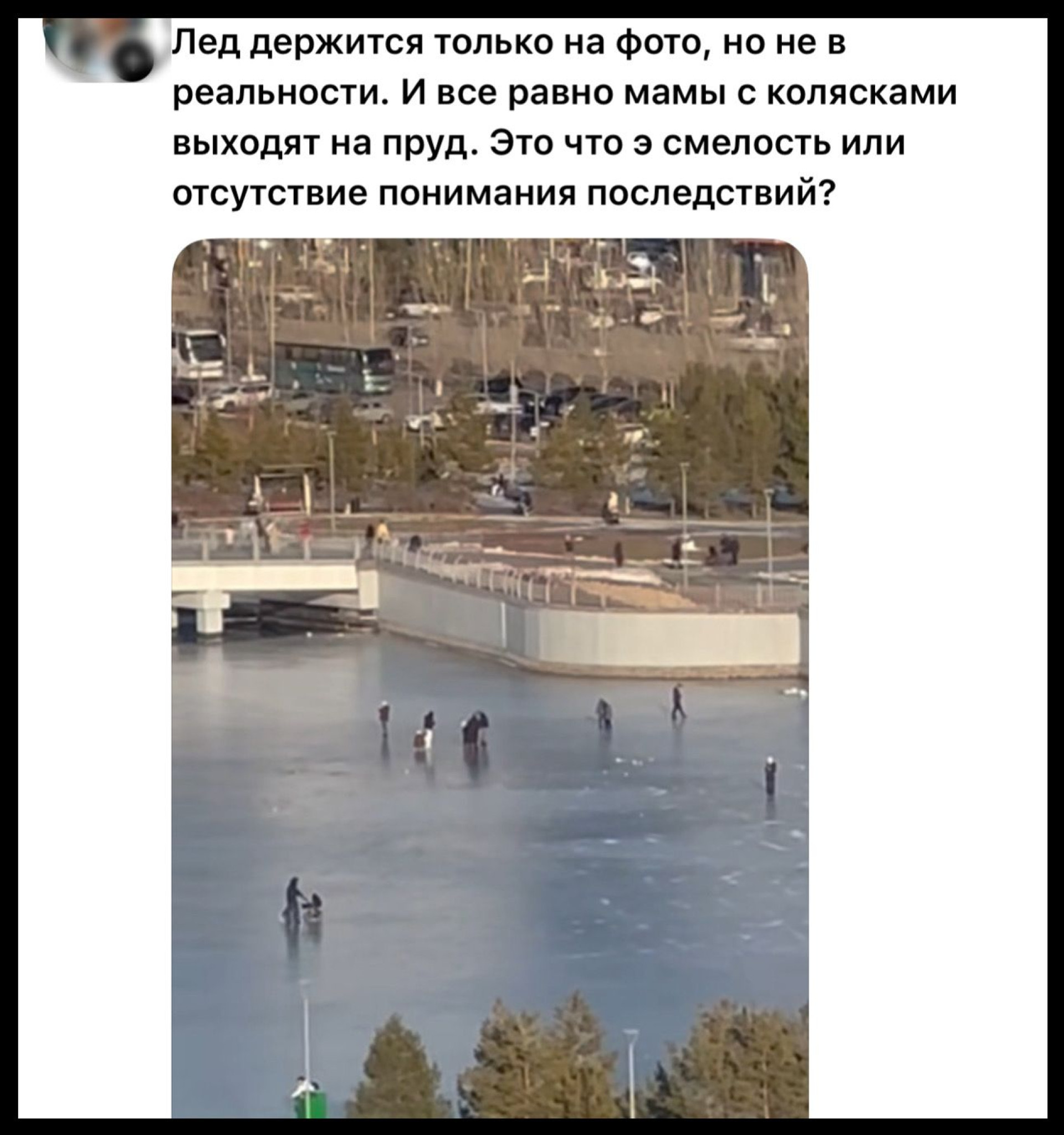 "Лёд держится только на фото, но не в реальности. И всё равно мамы с колясками выходят на пруд. Это что – смелость или отсутствие понимания последствий?" – говорится в публикации.
