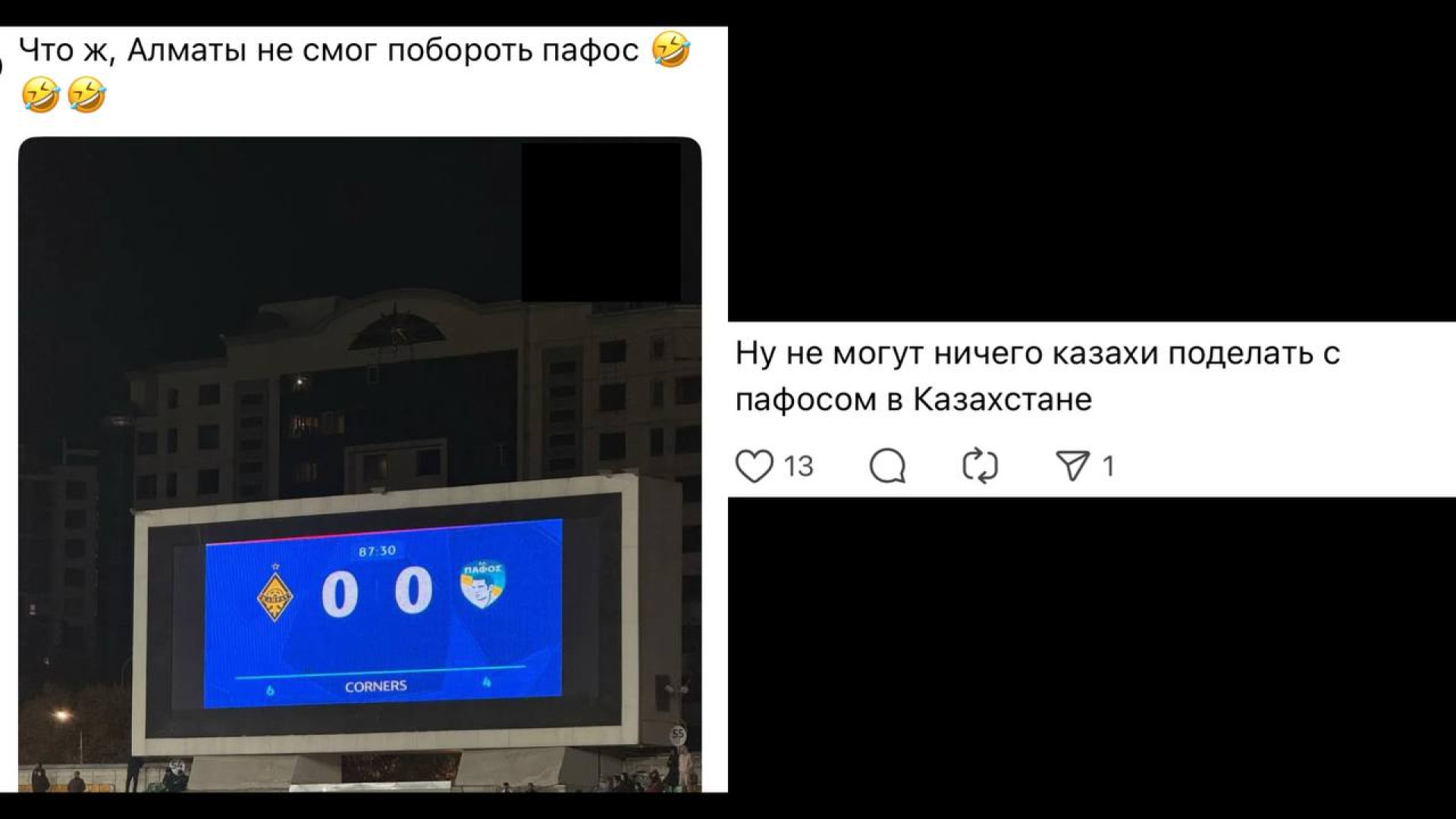 21 октября на стадионе "Центральный" в Алматы прошёл третий матч общего этапа Лиги чемпионов между алматинским "Кайратом" и кипрским клубом "Пафос". Игра завершилась со счетом 0:0. В сети матч не остался без внимания: ленты пользователей заполнили шутки и мемы, передаёт Tengri Life.