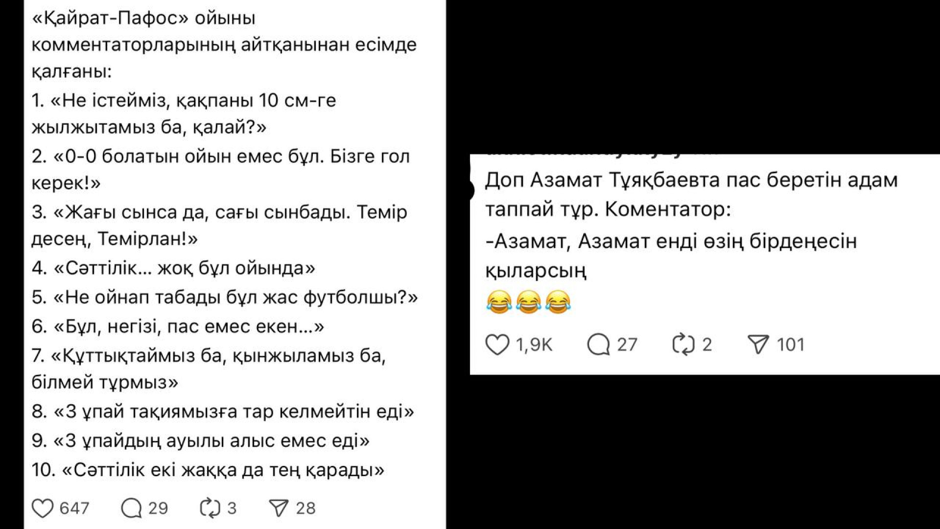 Внимание казахстанцев привлекла и работа спортивных комментаторов. Пользователи делились их самыми выразительными фразами.