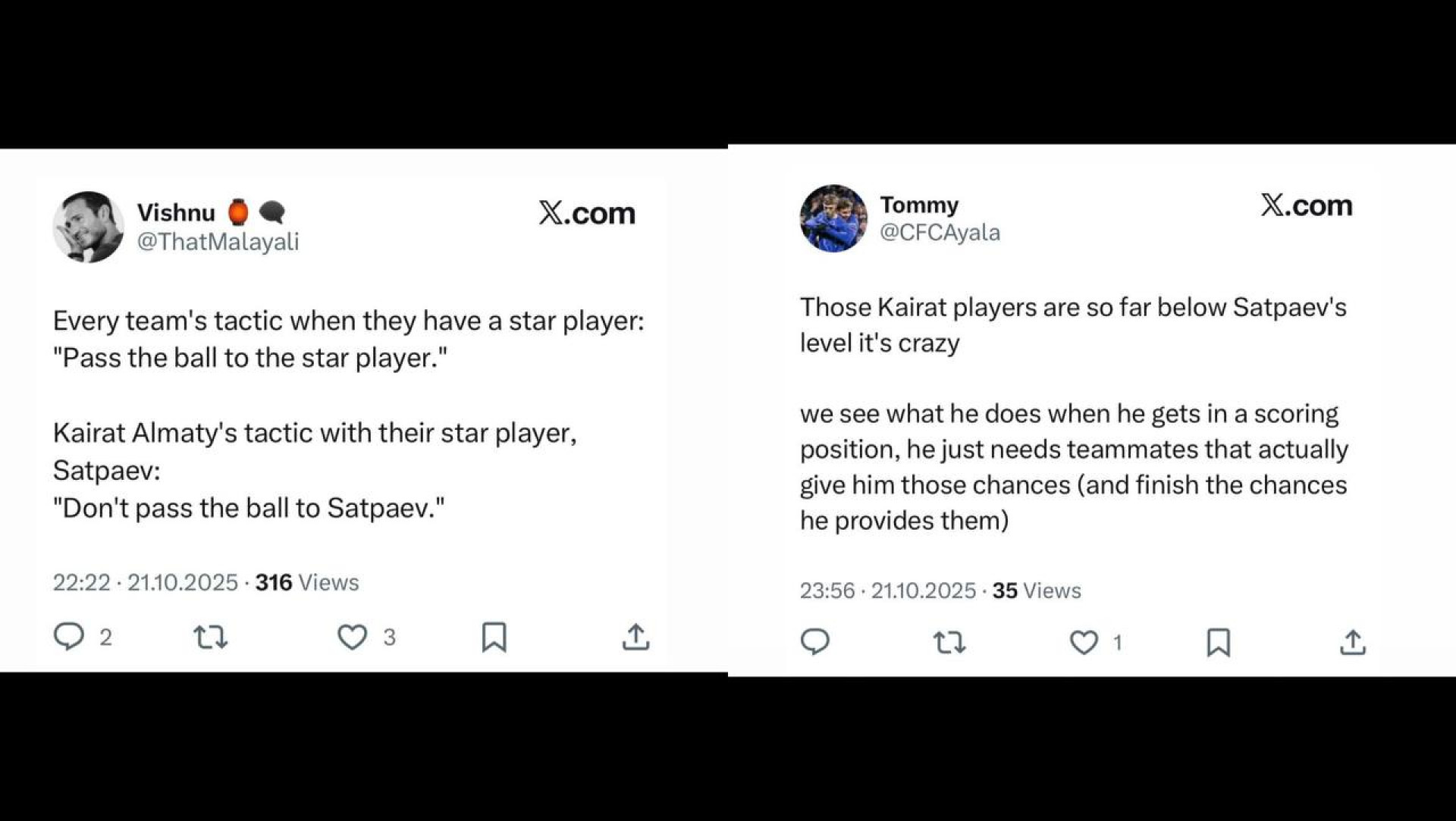 "Тактика любой команды: пасовать своей главной звезде. Тактика "Кайрата": не пасовать Сатпаеву", "Сатпаеву нужны партнёры по команде, которые действительно давали бы ему шансы", — поделились своим мнением болельщики.