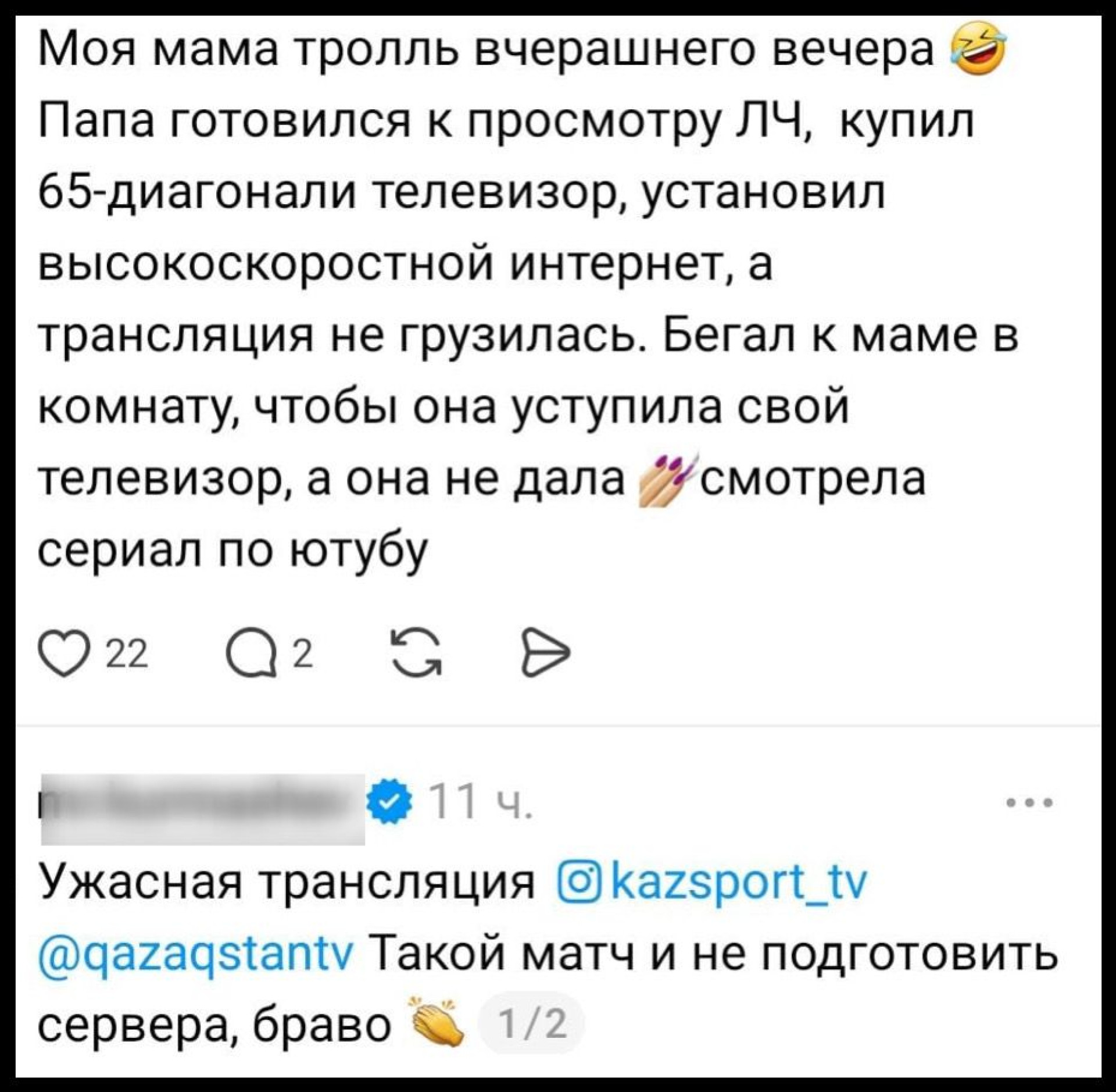 Значительная часть фанатов "Кайрата" не успела купить билеты - они разошлись за считаные часы. Многие решили смотреть матч дома или в кафе и ресторанах, готовя клубную атрибутику: шарфы, футболки, флаги. Атмосфера праздника ощущалась ещё до начала игры, однако с первых минут встречи появились жалобы в Threads на качество трансляции на некоторых казахстанских телеканалах.