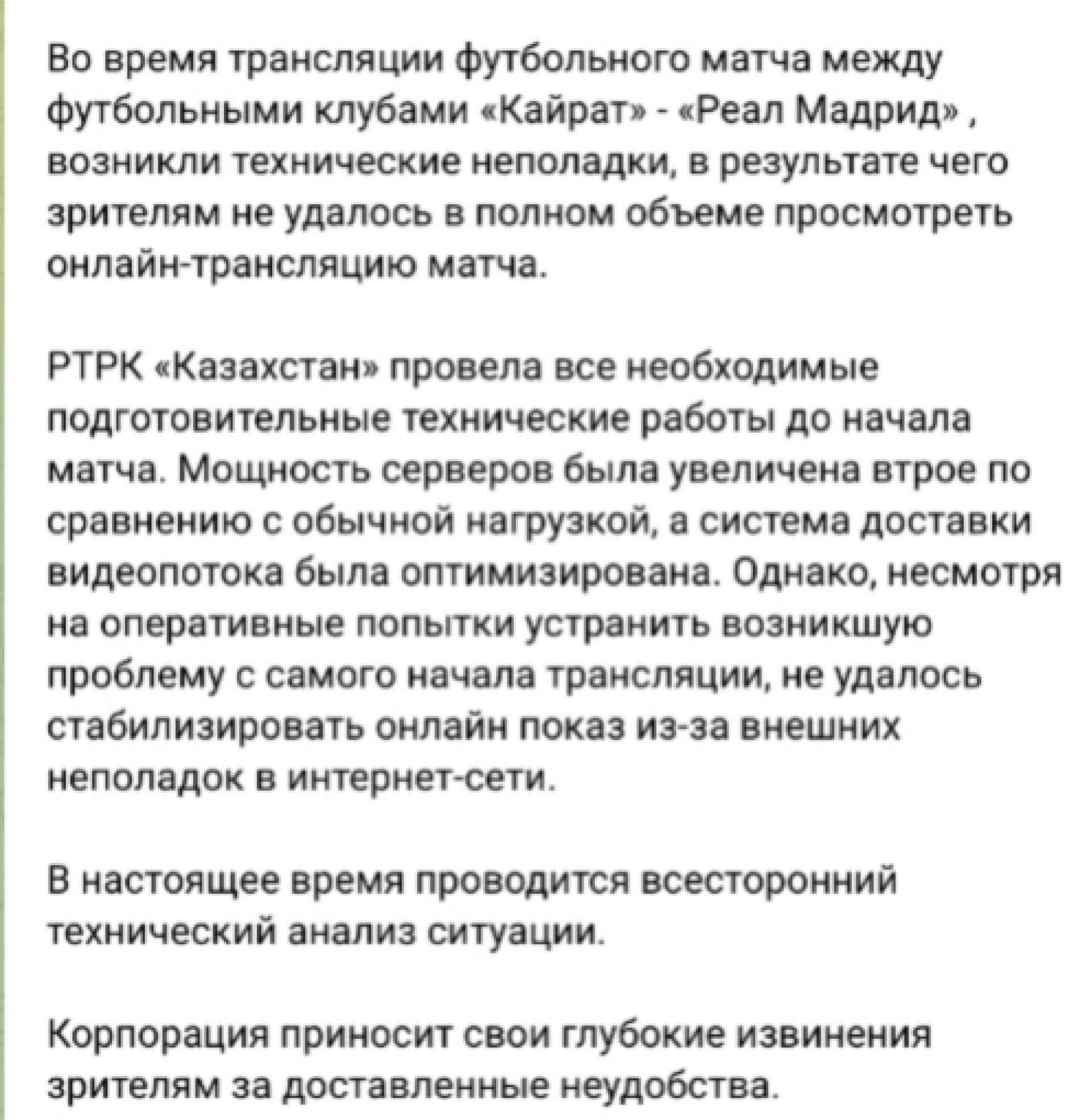"Во время онлайн-трансляции матча "Кайрат" - "Реал Мадрид" произошёл сбой на платформе ТРК "Казахстан" из-за большого количества пользователей. Временно были недоступны сайты qazaqstan.tv, qazsporttv.kz, а также приложения BeeTV, TV+ и другие", - сообщили нам в ведомстве.