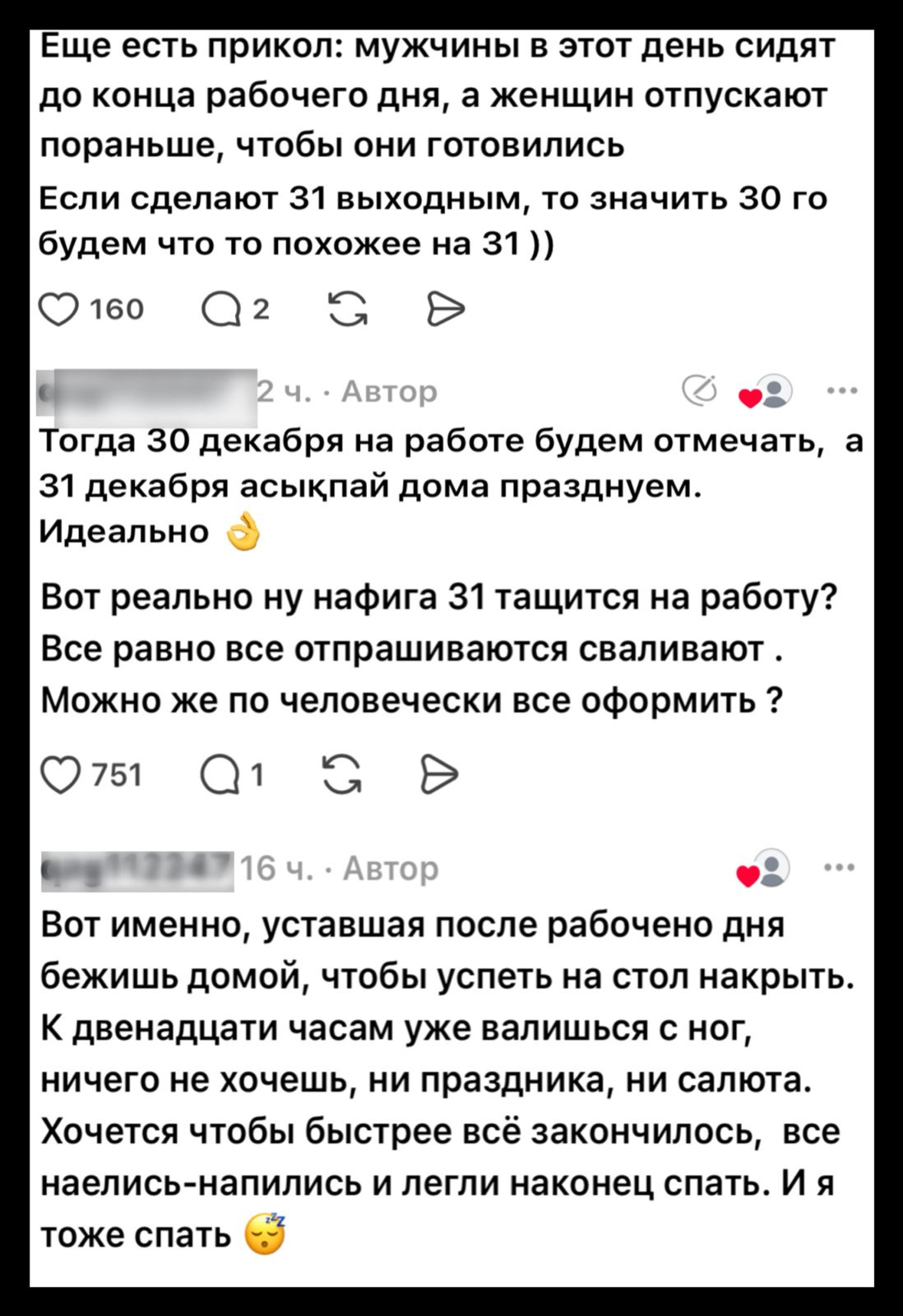 "Кто хочет, чтобы 31 декабря объявили выходным днем? По сути, все равно никто не работает, просто так просиживаем время на работе, хотя дома куча дел и готовки", — спросил автор.