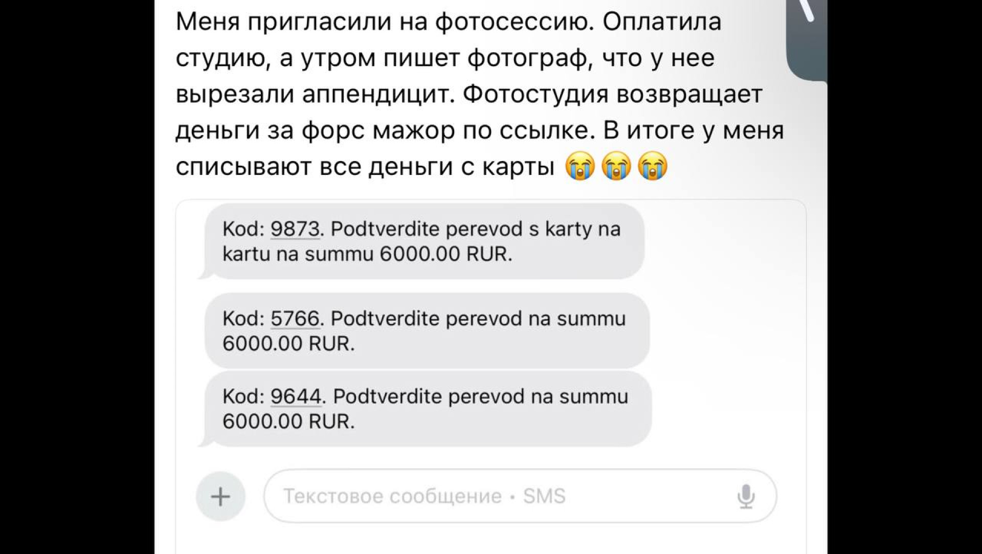 "Меня пригласили на фотосессию. Оплатила студию, а утром пишет фотограф, что у неё вырезали аппендицит. Фотостудия возвращает деньги за форс-мажор по ссылке. В итоге у меня списывают все деньги с карты", — рассказала пострадавшая.
