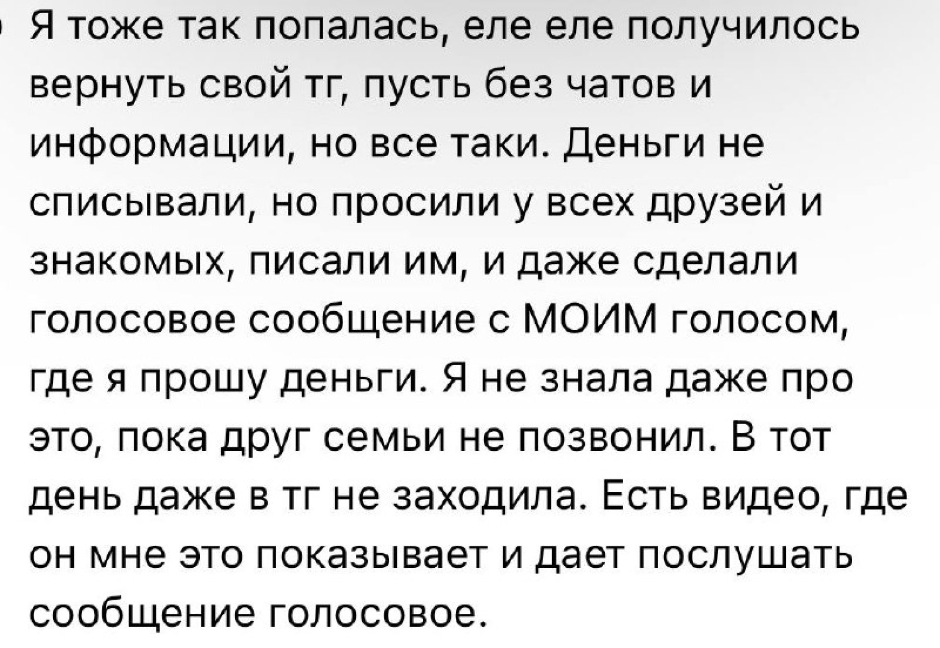 "Попалась в январе. Списали всё, что было. Урок на всю жизнь", "У меня взломали Telegram, потом от моего имени просили деньги у друзей. Даже сделали голосовое сообщение с моим голосом. Это был настоящий шок", — поделились комментаторы.