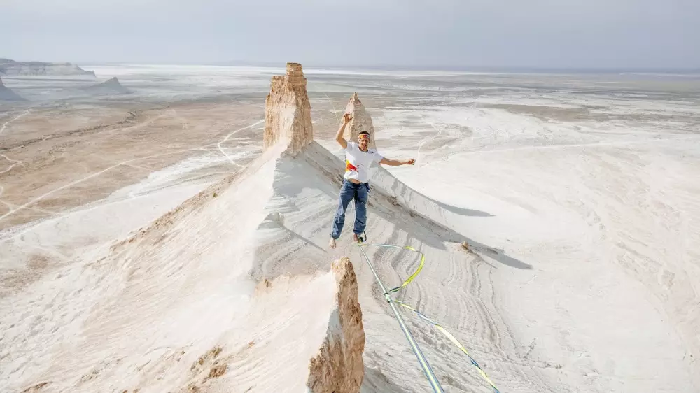 Сильнейший ветер, 50-градусная жара и маленькая фигурка человека на высоте 200 метров между клыков урочища Бозжыра – так началось приключение ивестного эстонского слэклайнера в Казахстане.